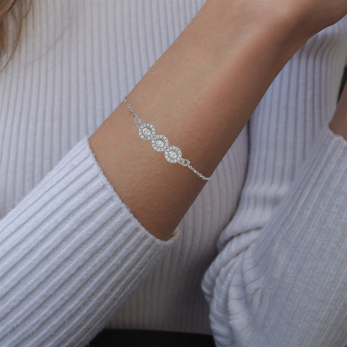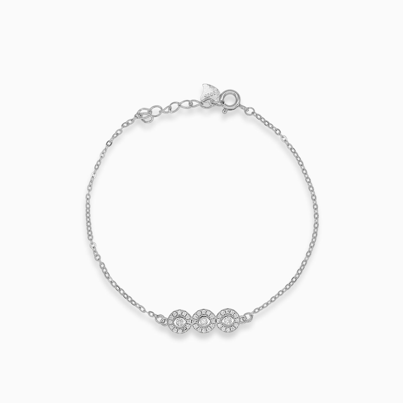 Obohaťte svůj styl tímto stříbrným náramkem se třemi vzorovými kruhy zdobenými kubickými zirkony. Náramek nabízí nastavitelnou délku a je zajištěn pružinovým zapínáním. Jeden z konců je zdoben stříbrným přívěskem ve tvaru srdce.