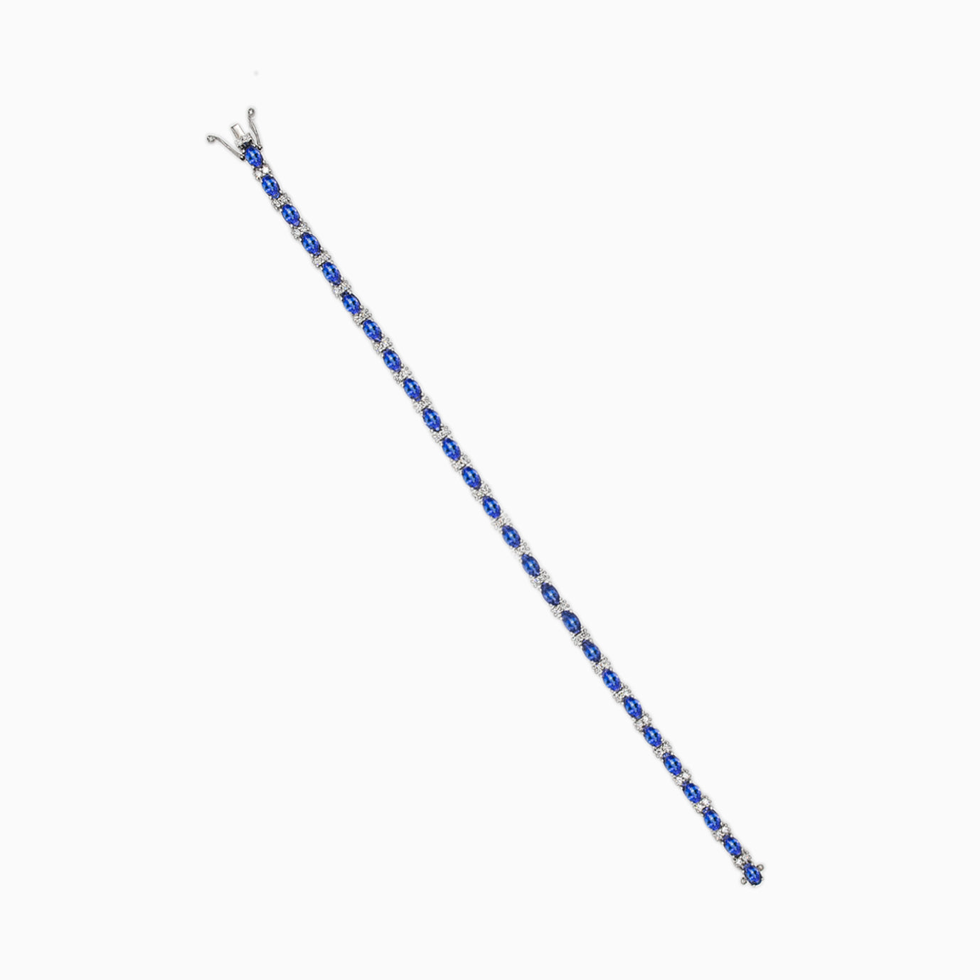 Výjimečný tennisový náramek, nádherně prezentující kameny Tanzanit a diamanty, který je doplněn otevíracím krabičkovým zapínáním.