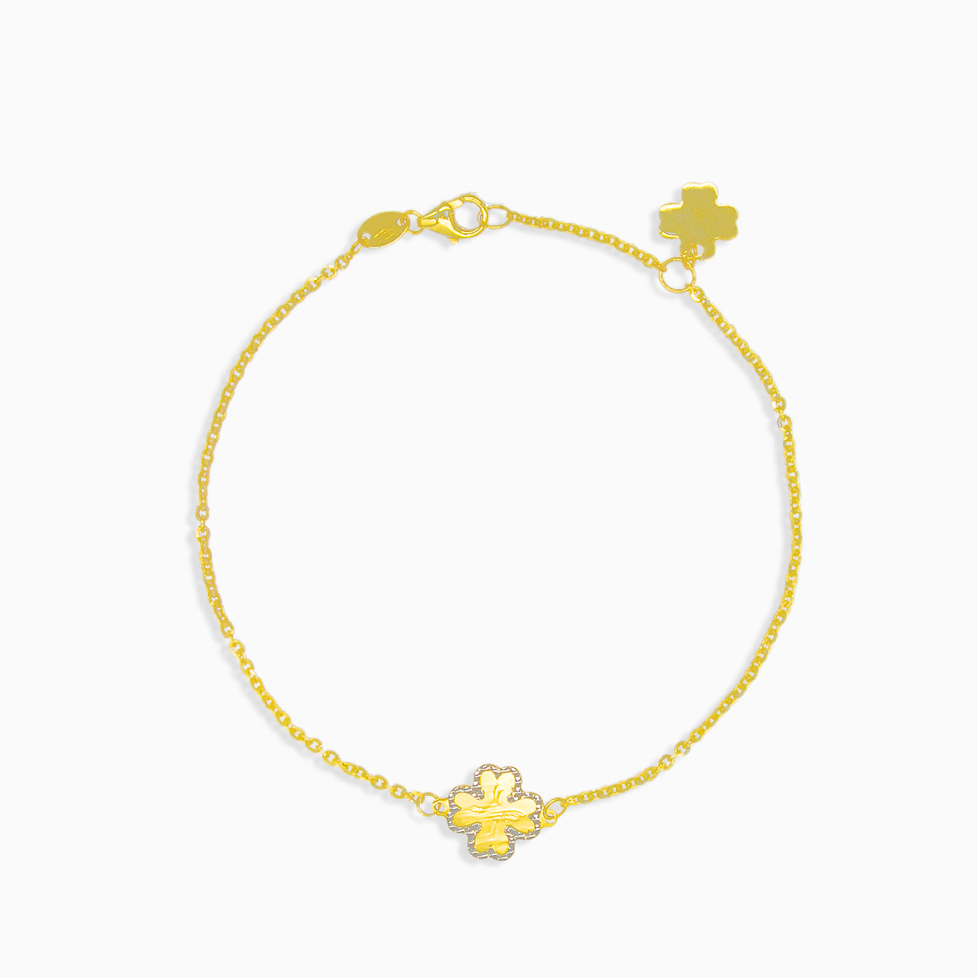 Přidejte špetku štěstí do svého stylu s tímto zlatým 14kt náramkem zdobeným čtyřlístkem, který je lemovaný bílým zlatem.