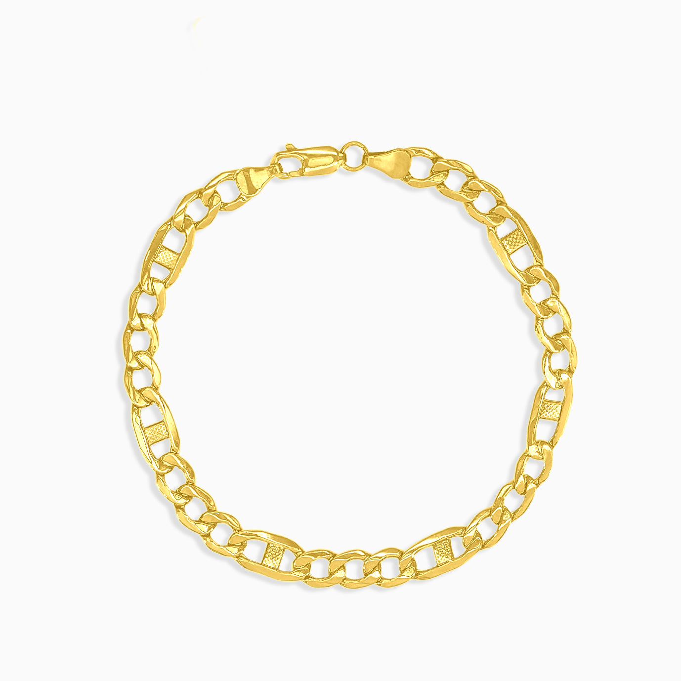 Pozvedněte svůj styl tímto masivním náramkem Figaro ze14kt žlutého zlata zdobeným poutavým vzorem na jeho částech. Zabezpečený karabinovým zapínáním zaručuje jak eleganci, tak bezpečnost.