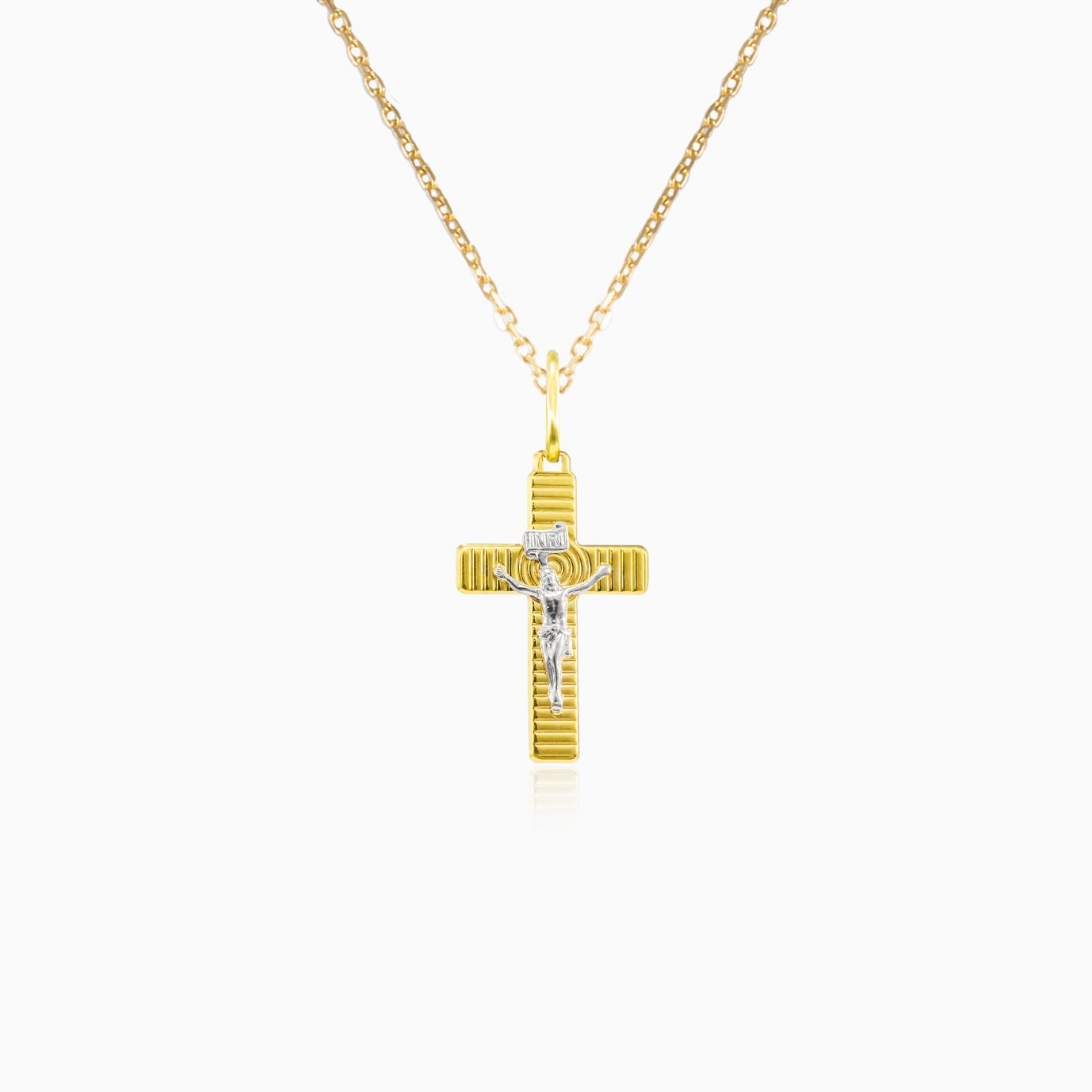 Moderní křížkový přívěsek z 14-karátového žlutého zlata.