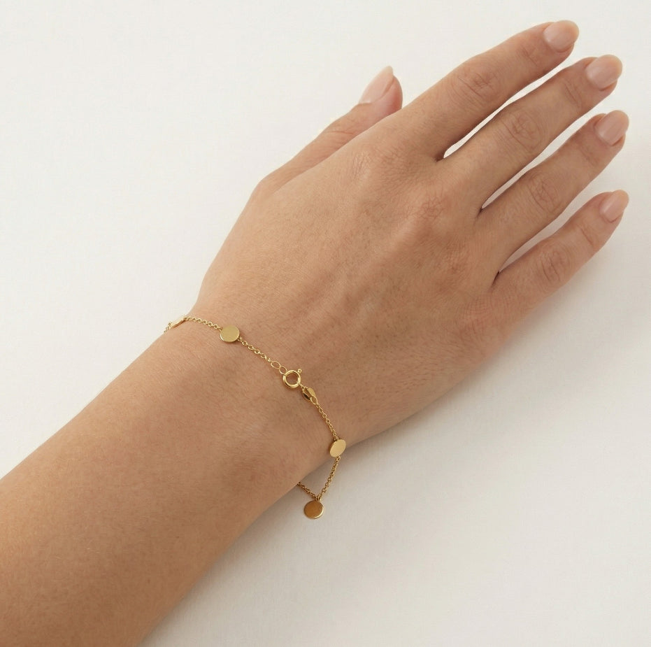 Zvyšte svou eleganci s tímto 14kt zlatým náramkem zdobeným šesti výjimečnými penízky. Náramek je uzavíratelný pružinovým kroužkem, čímž se stává perfektním doplňkem pro různé příležitosti.