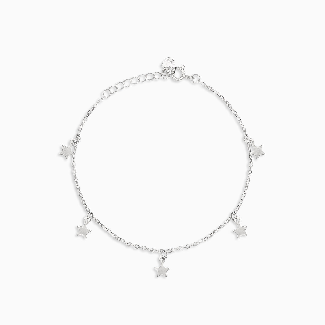 Dodejte svému kotníku nádech nebeského kouzla díky našemu stříbrnému náramku s rozkošnými přívěsky hvězdiček, který se zapíná na pružinový kroužek pro snadné nošení.