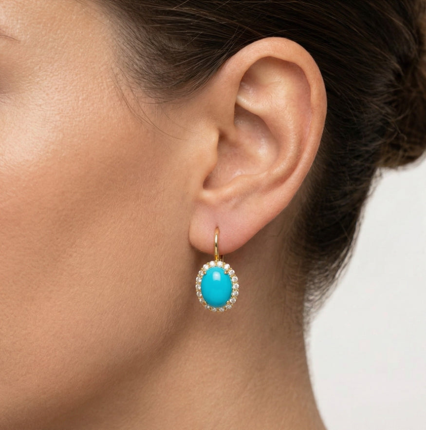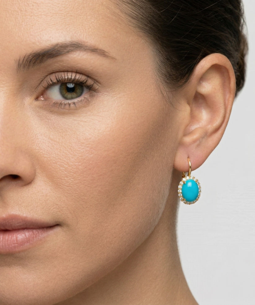 Nádherné klasické náušnice s aureolou z kubické zirkonie, která obklopuje oválný tyrkysový kabošon.