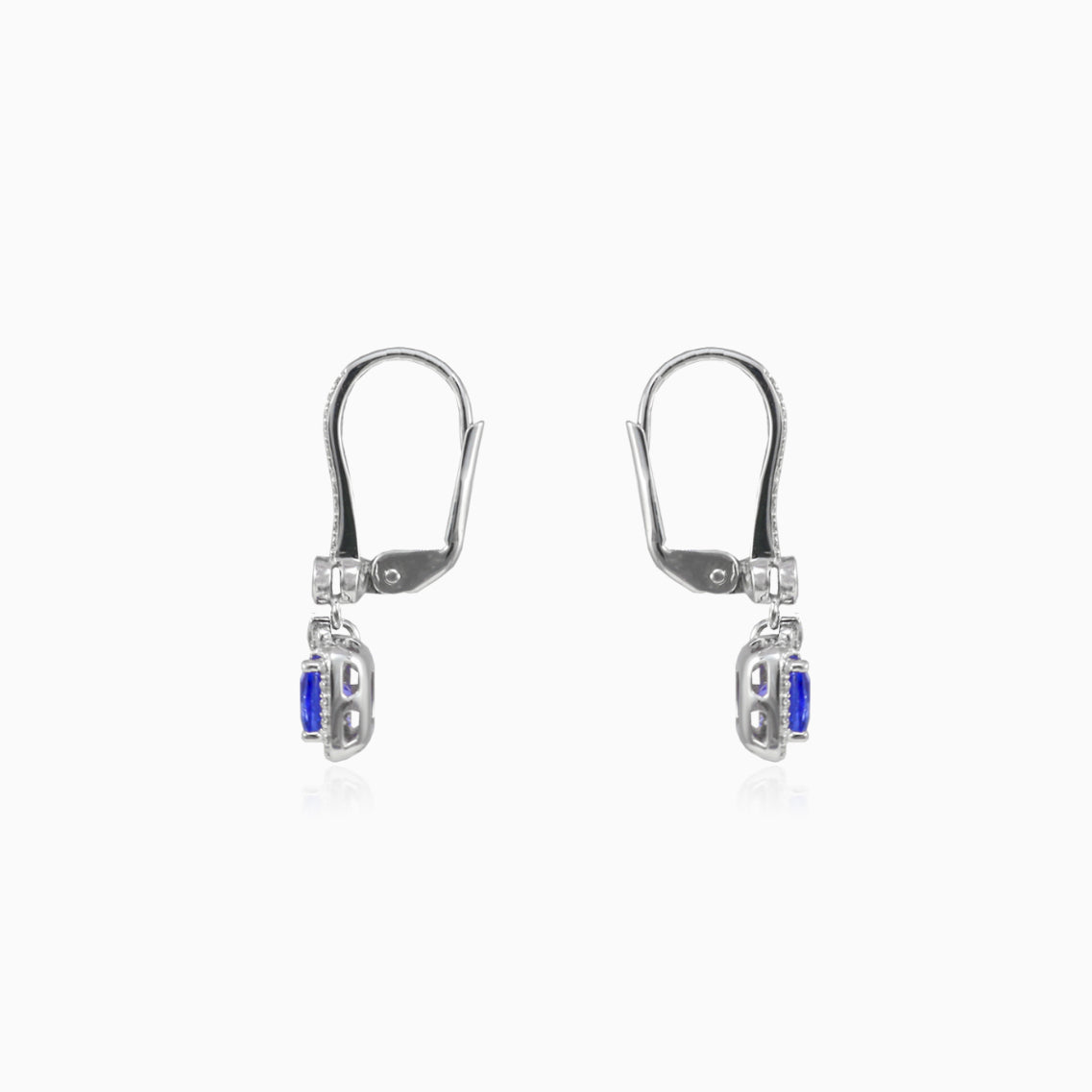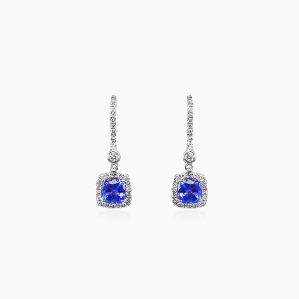Božské náušnice z 14-karátového bílého zlata s visacím tanzanitem cushion brusu obklopeným diamanty brilliant brusu.