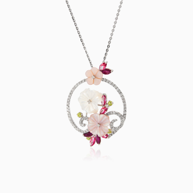 Jemný a elegantní náhrdelník z 14-karátového bílého zlata s diamanty celkové váhy 0,55 ct, přírodním peridotem, růžovým quartzem/křemenem a perleťovými květinami.