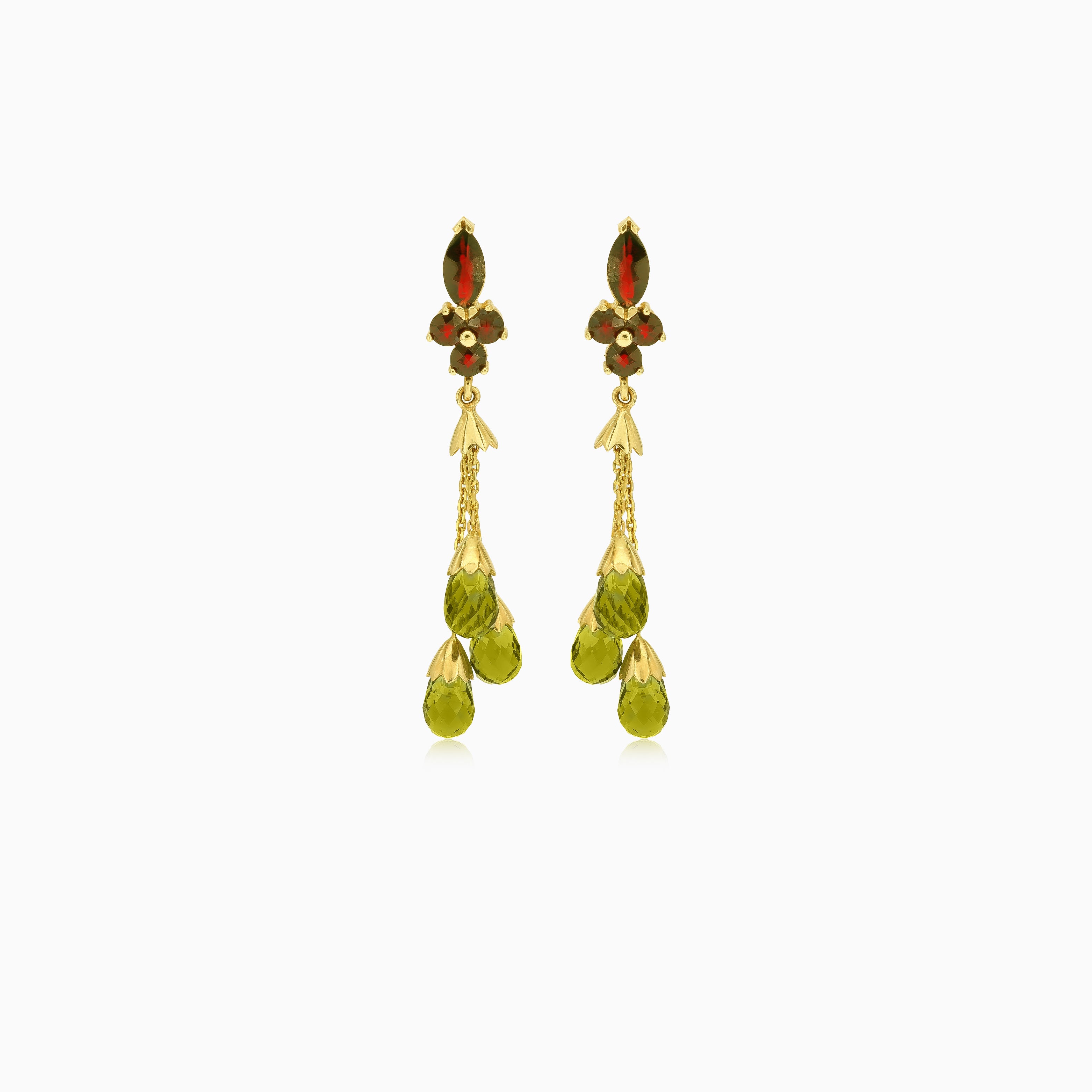 Ozdobte se rafinovaně těmito náušnicemi ze 14kt žlutého zlata. Obsahují podmanivý granát v markýzovém a kulatém jemném stupňovitém výbrusu, doplněný třemi oslnivými brioletkami vltavínu v hruškovitém výbrusu. Společné puzetové zasazení a zapínání na patentku dodávají náušnicím jistotu a styl.