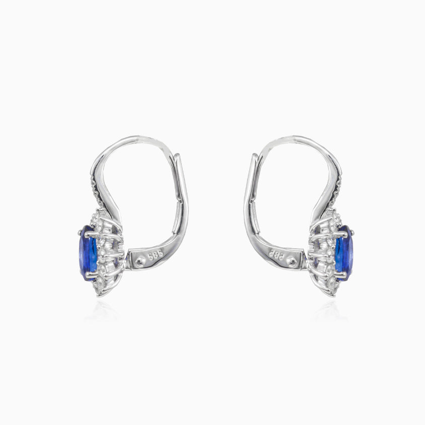 Tyto majestátní náušnice jsou vyrobeny z 14K bílého zlata a jsou doplněny hlavním středovým modrým safírem. Kolem kamene se poté nachází svatozář, která je tvořena dvanácti diamanty s briliantovým výbrusem. Náušnice jsou opatřeny patentovým uzávěrem, který je bezpečný pro každodenní nošení.