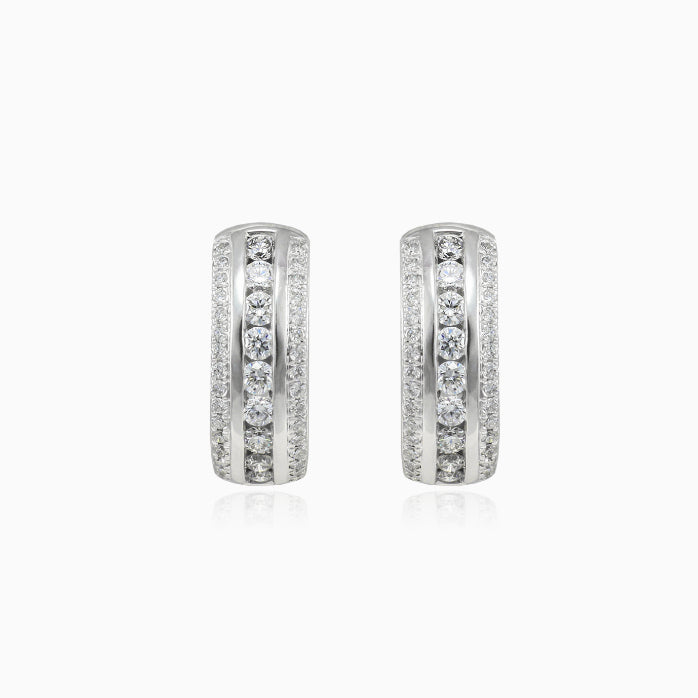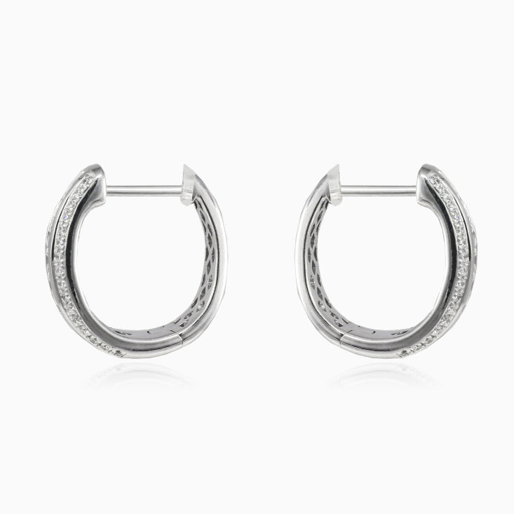 Masivní náušnice jsou vyrobeny z 14K bílého zlata a jsou doplněny třemi řadami 82 kanálků a brilianty s diamantovým výbrusem pro oslnivější průnik světla kamenem. Náušnice je opatřena patentovým uzavíráním.