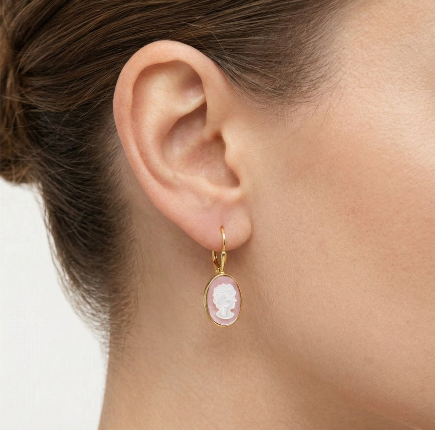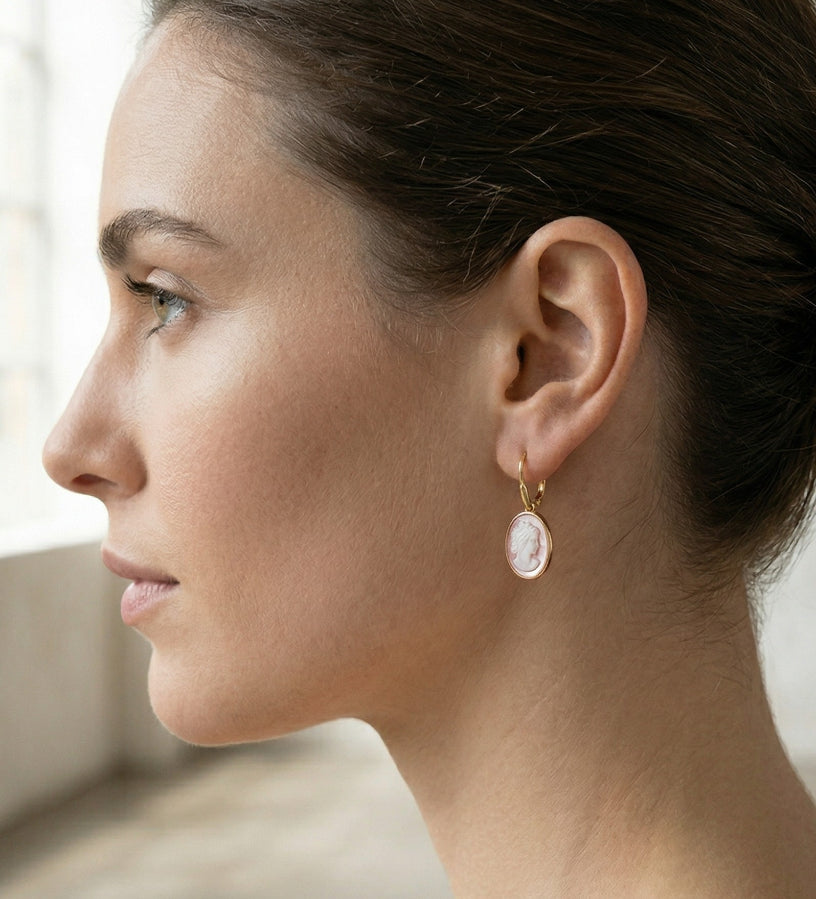 Náušnice z 14-karátového žlutého zlata v klasickém oválném tvaru s ručně vyřezávaným Kamej v luneta osazení.