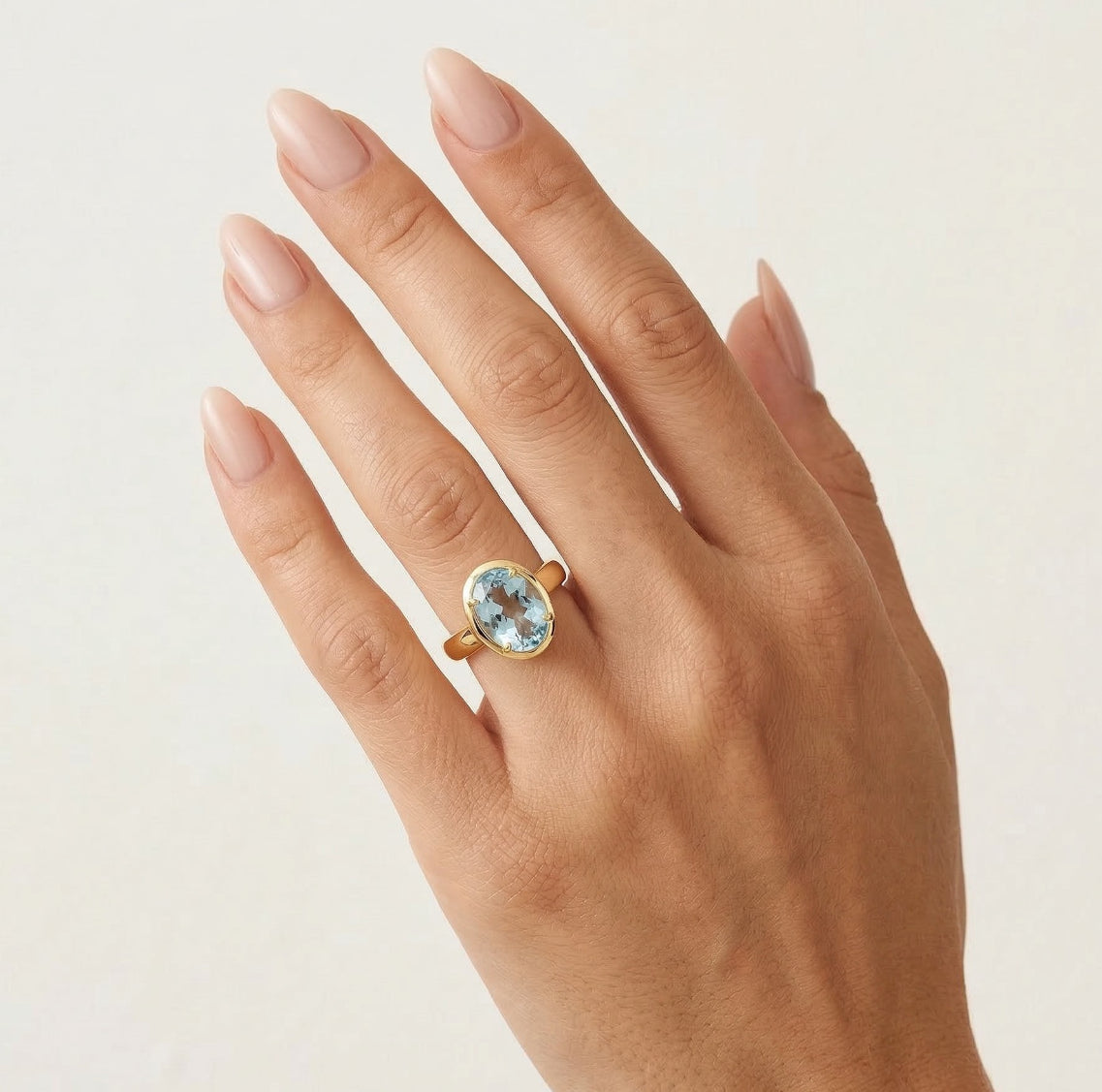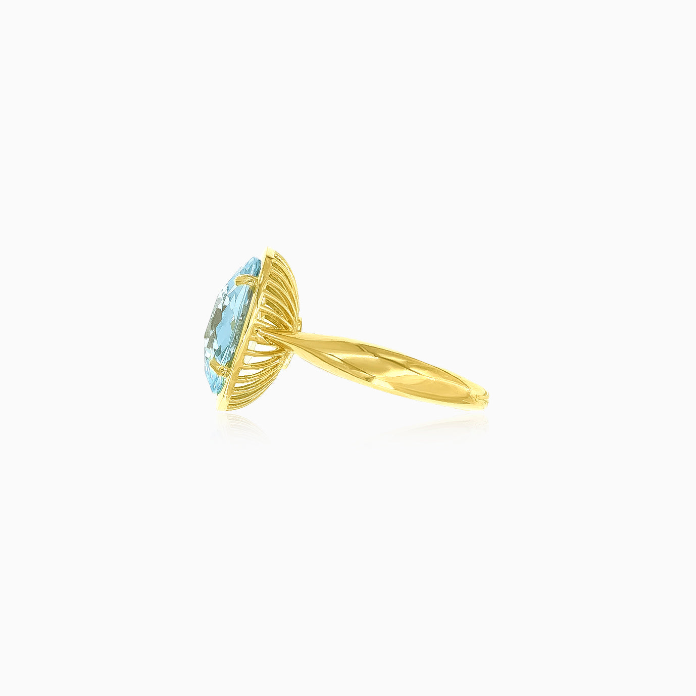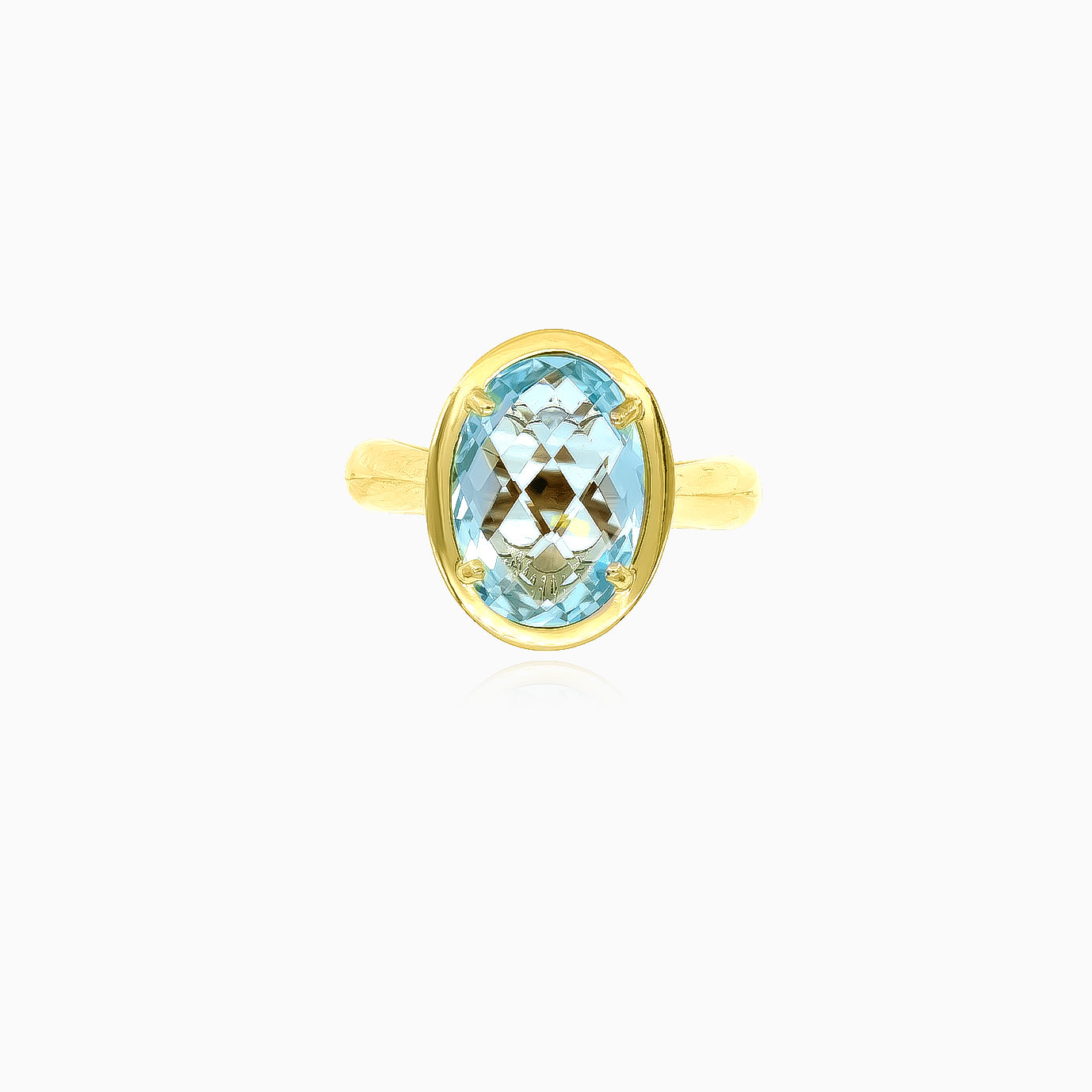 Dámský prsten ze 14karátového žlutého zlata s lesklým modrým topazem oválného brusu, který spojuje lesk žlutého zlata s nadčasovou elegancí.