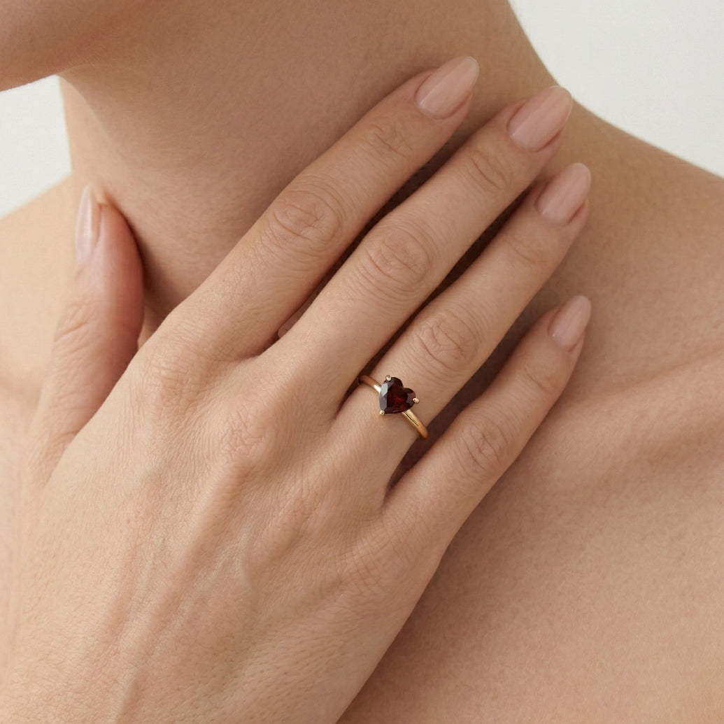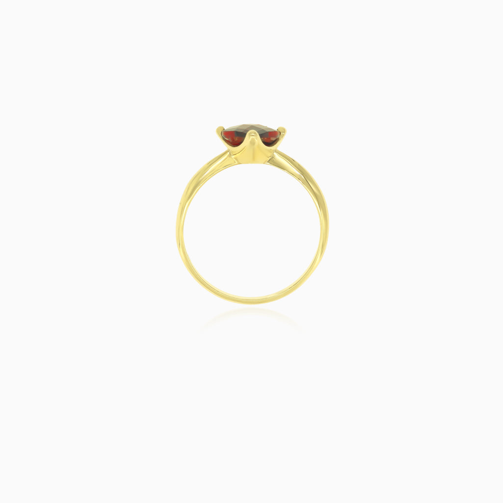 Prsten ze žlutého zlata ve tvaru srdce s granátem