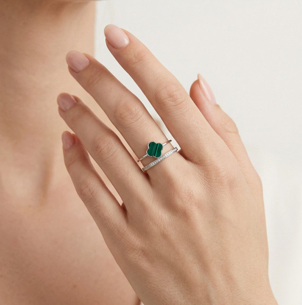 Pozvedněte svůj styl s naším dámským stříbrným prstenem s podmanivým zeleným achátem v ploše broušeném rámečku, doplněným třpytivými kubickými zirkony v kulatém jemném stupňovitém výbrusu na okouzlujícím vzoru čtyřlístku.