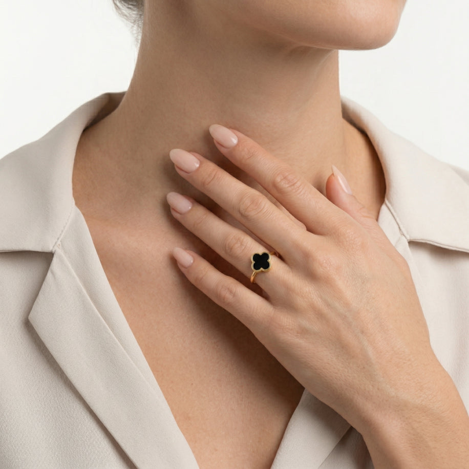 Zlatý prsten s onyxem ve tvaru čtyřlístku