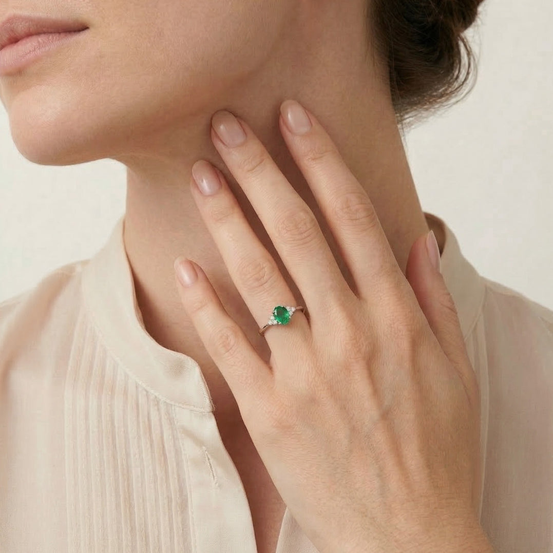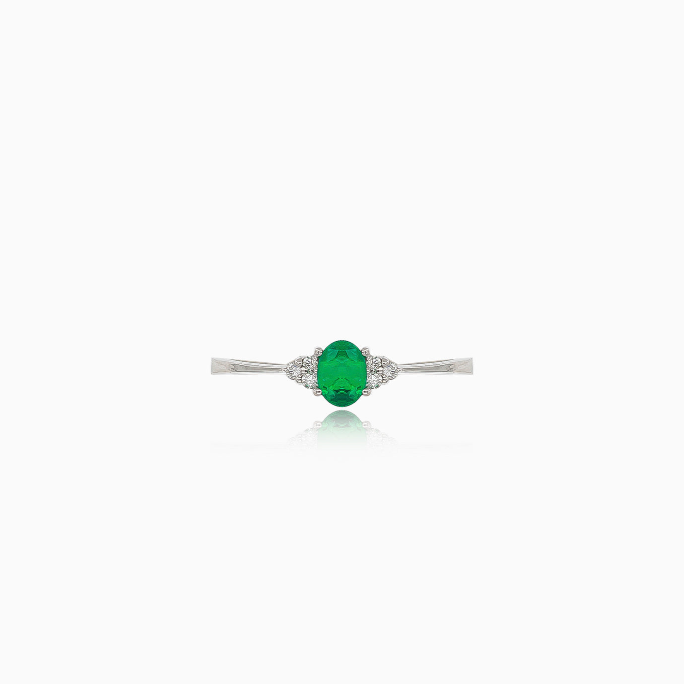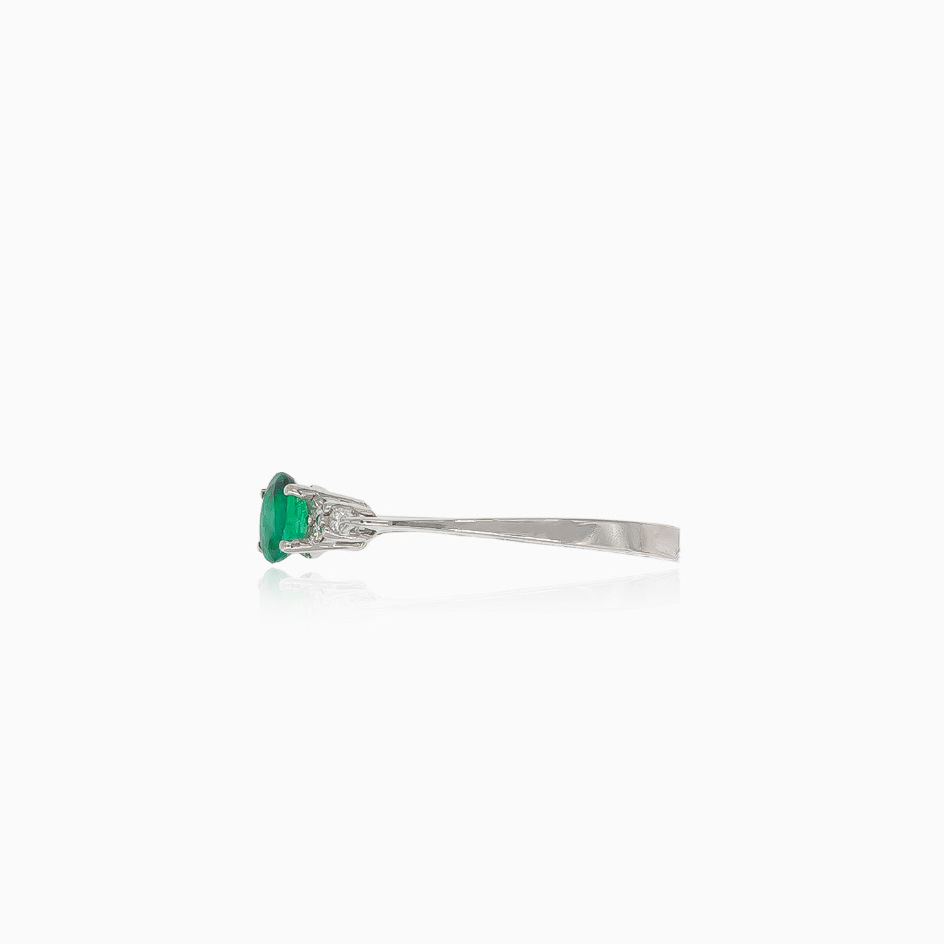 14kt prsten z bílého zlata zdobený oválným smaragdem o hmotnosti 0,34ct se čtřymi krapnami. Doplněno malými kulatými diamanty o váze 0,06ct s čistotou VS a barevným stupněm G.