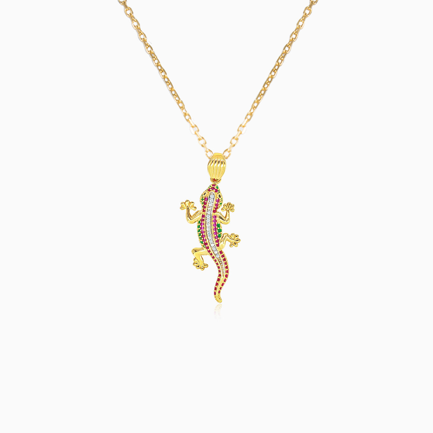 Ponořte se do světa detailního řemesla s tímto barevným přívěskem ještěrky z 14karátového žlutého zlata. Vyzdobený syntetickými rubíny a smaragdy, je dále zdobený kubickými zirkony v sdíleném krapnovém nastavení. Pohyblivé končetiny a oči z černého onyxu doplňují realistický vzhled přívěsku.