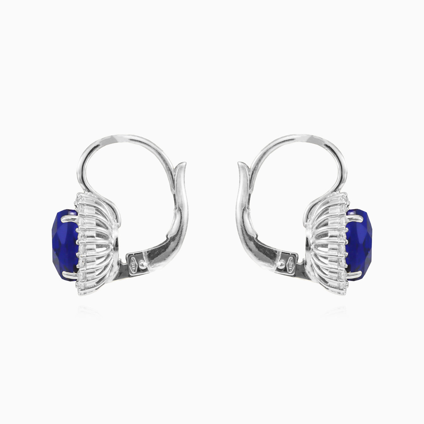 Tyto dámské visací náušnice z bílého 14kt zlata mají jako centrální kámen oválný syntetický safír jemného stupňovitého brusu, elegantně obklopený kulatými kubickými zirkony jemného stupňovitého brusu. Luxusní královský design dotváří zasazení s hroty a zapínání na páčku.