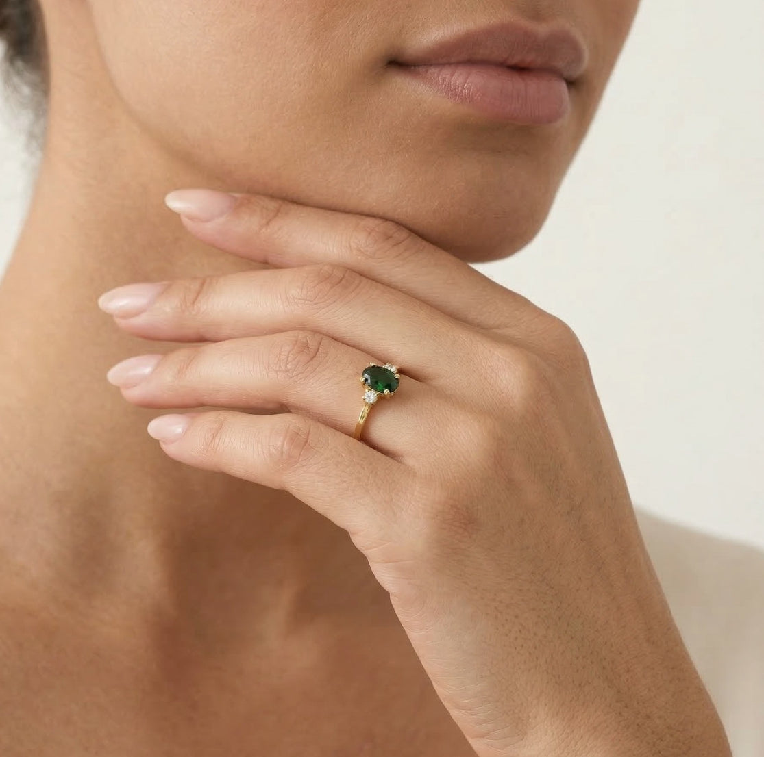 Zářivý dámský prsten ze 14kt žlutého zlata se syntetickým smaragdem a kubickými zirkony, dokonalá kombinace elegance a šarmu.