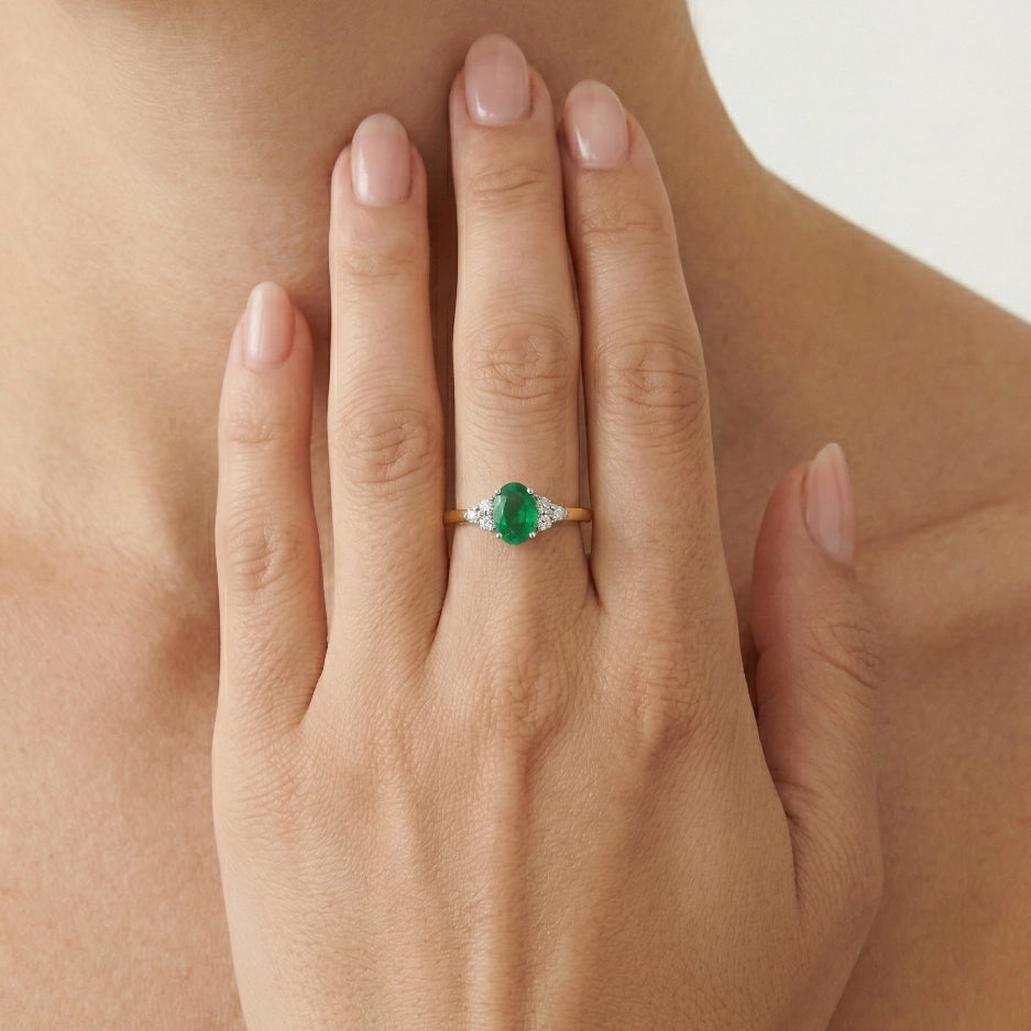 Elegantní prsten z 18kt zlata s diamantem a oválným smaragdem