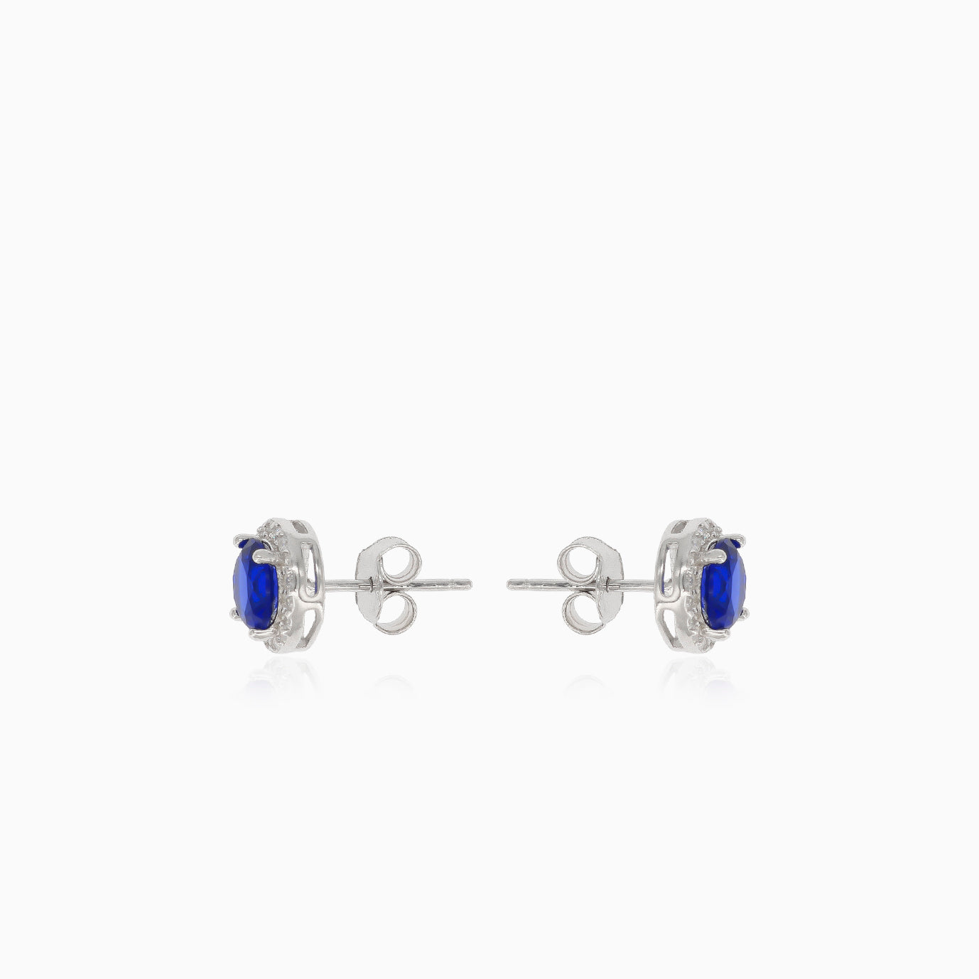 Klasické stříbrné náušnice s lesklými syntetickými safíry zvýrazněnými svatozáří třpytivých kubických zirkonů pro nadčasovou eleganci.