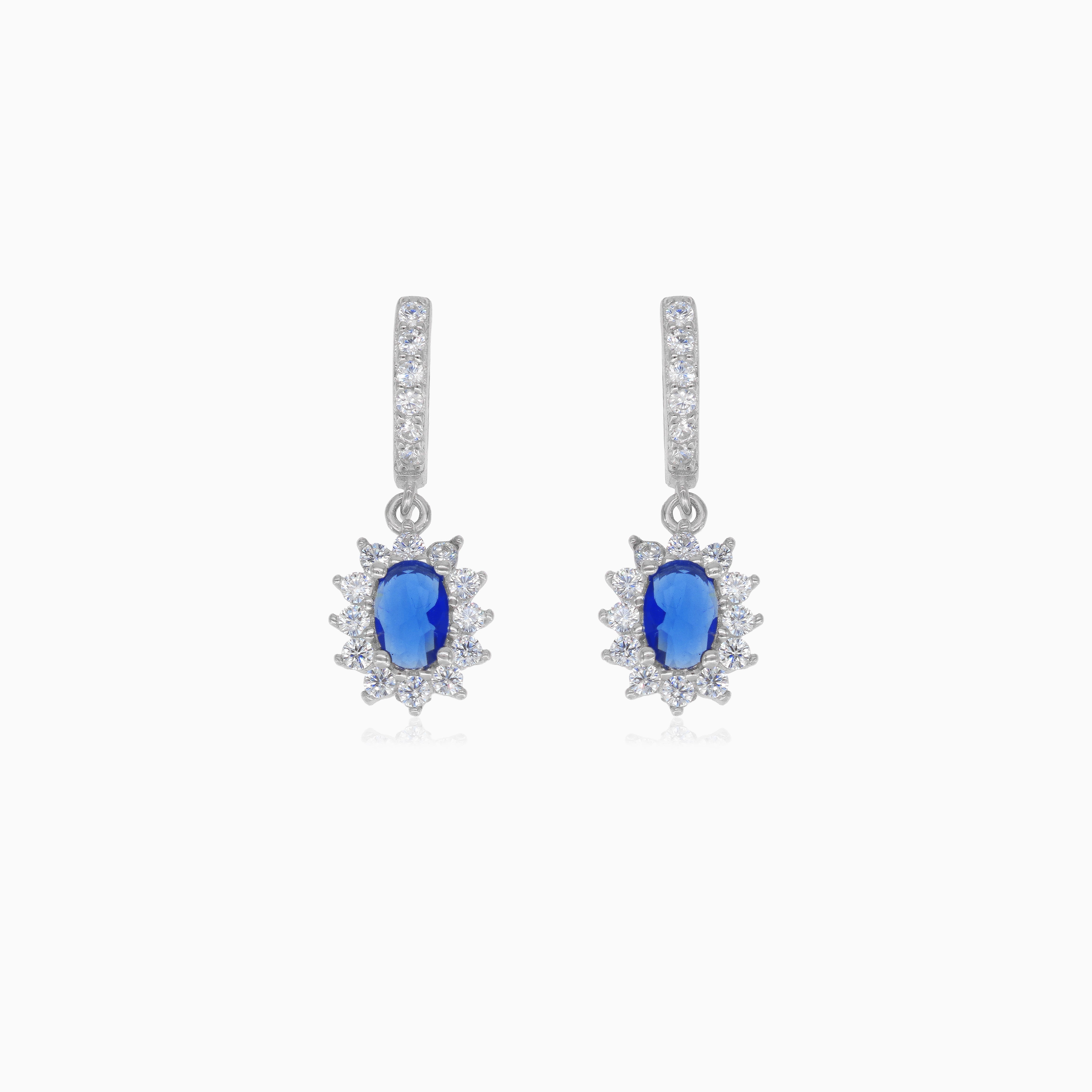 Tyto sofistikované visací stříbrné náušnice mají jako střed oválný syntetický safír jemného stupňovitého brusu, doplněný třpytivými kulatými zirkony kolem a na objímkovém zapínání. Osazení hroty zvýrazňuje lesk kamenů a nabízí rafinovaný nádech jakémukoli vzhledu.
