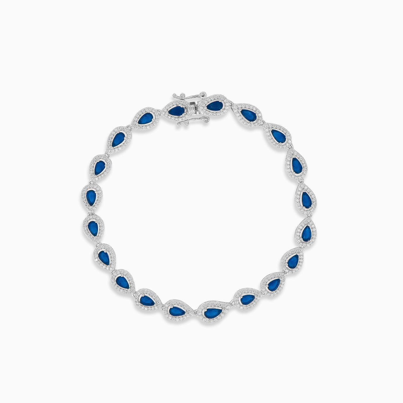 Pozvedněte svou eleganci s tímto stříbrným náramkem s jemnými hruškovými syntetickými safíry stupňovitého brusu obklopenými kubickými zirkony v jiskřivém designu svatozáře. Osazení hroty a otevřené zapínání ve tvaru krabičky zajišťují odolnost a pohodlí, takže náramek je oslnivou volbou pro každou příležitost.