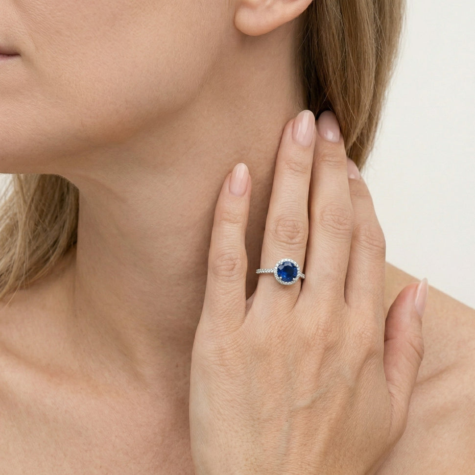 Dopřejte si luxus s naším dámským stříbrným prstenem se syntetickým safírem a kubickými zirkony v kulatém jemném stupňovitém výbrusu, jemně zasazenými v záhybu.