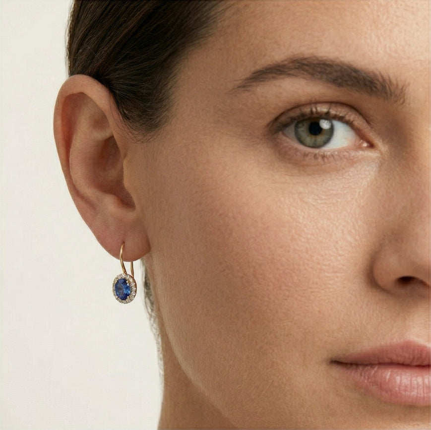 Klasické náušnice z 14-karátového žlutého zlata s oválně broušeným syntetickým safírem a aureolou kubické zirkonie.