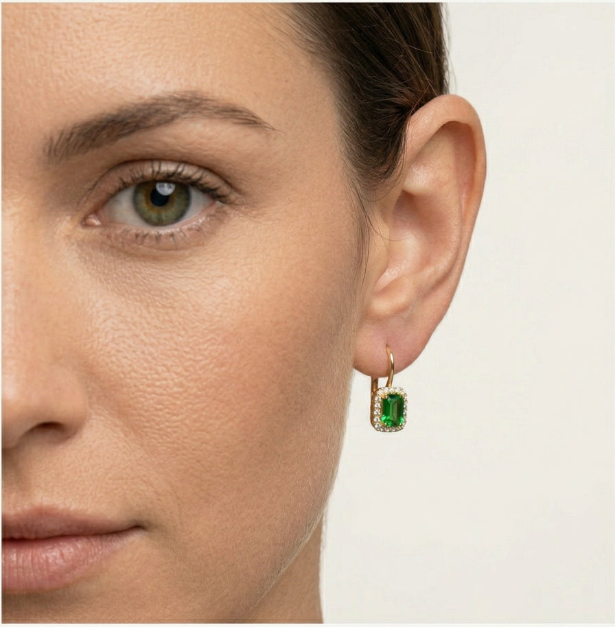 Náušnice ze 14K žlutého zlata v kombinaci se zářivým broušeným syntetickým smaragdem a lunetou z kubických zirkonů.