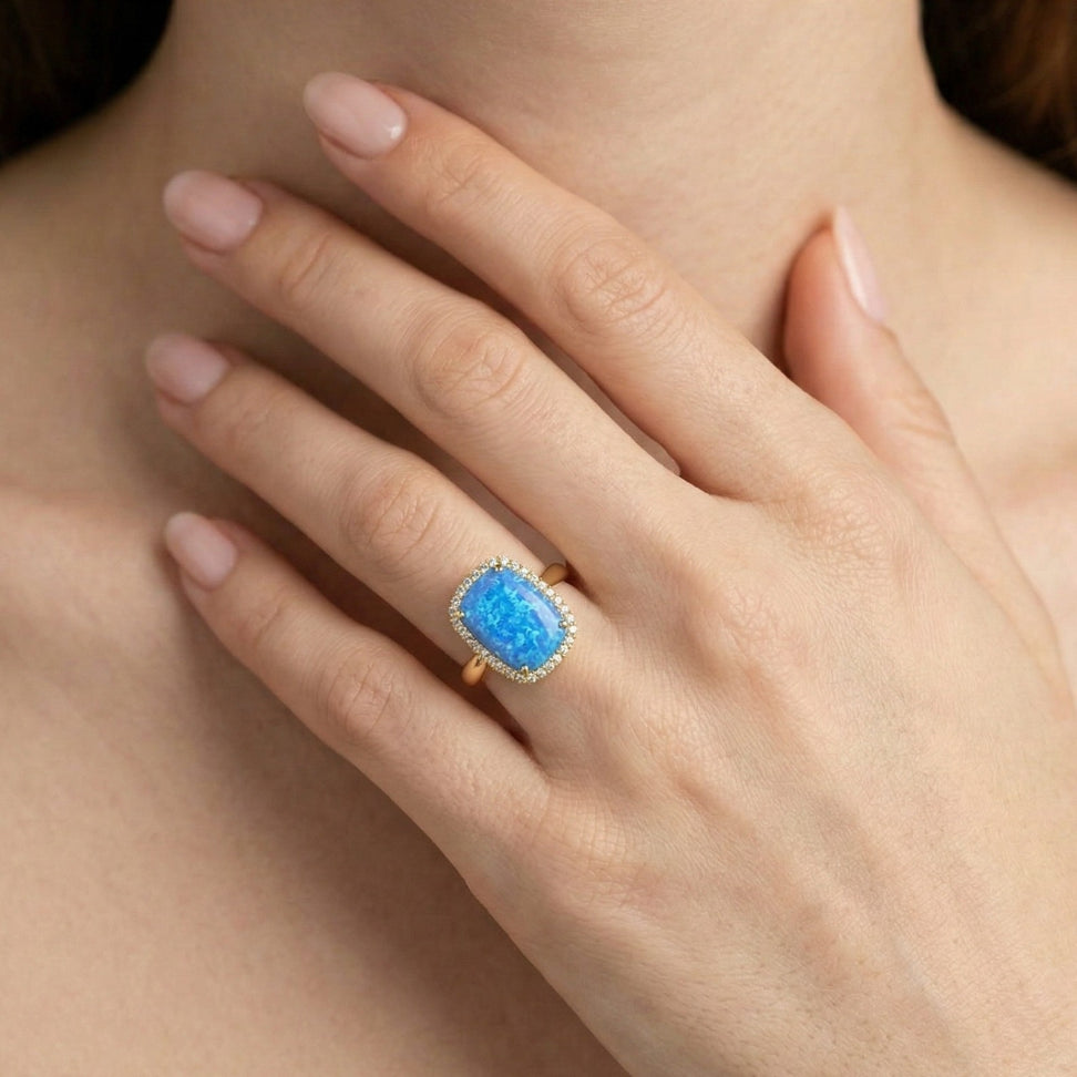 Prsten z 14-karátového žlutého zlata s kabošonským modrým opálem obklopeným kubickou zirkonií.
