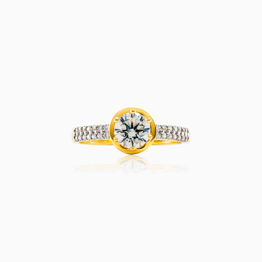 14-karátový prsten ze žlutého zlata se zirkonem ve středu, dvěma vysoce leštěnými řadami a kubickými zirkony po stranách.