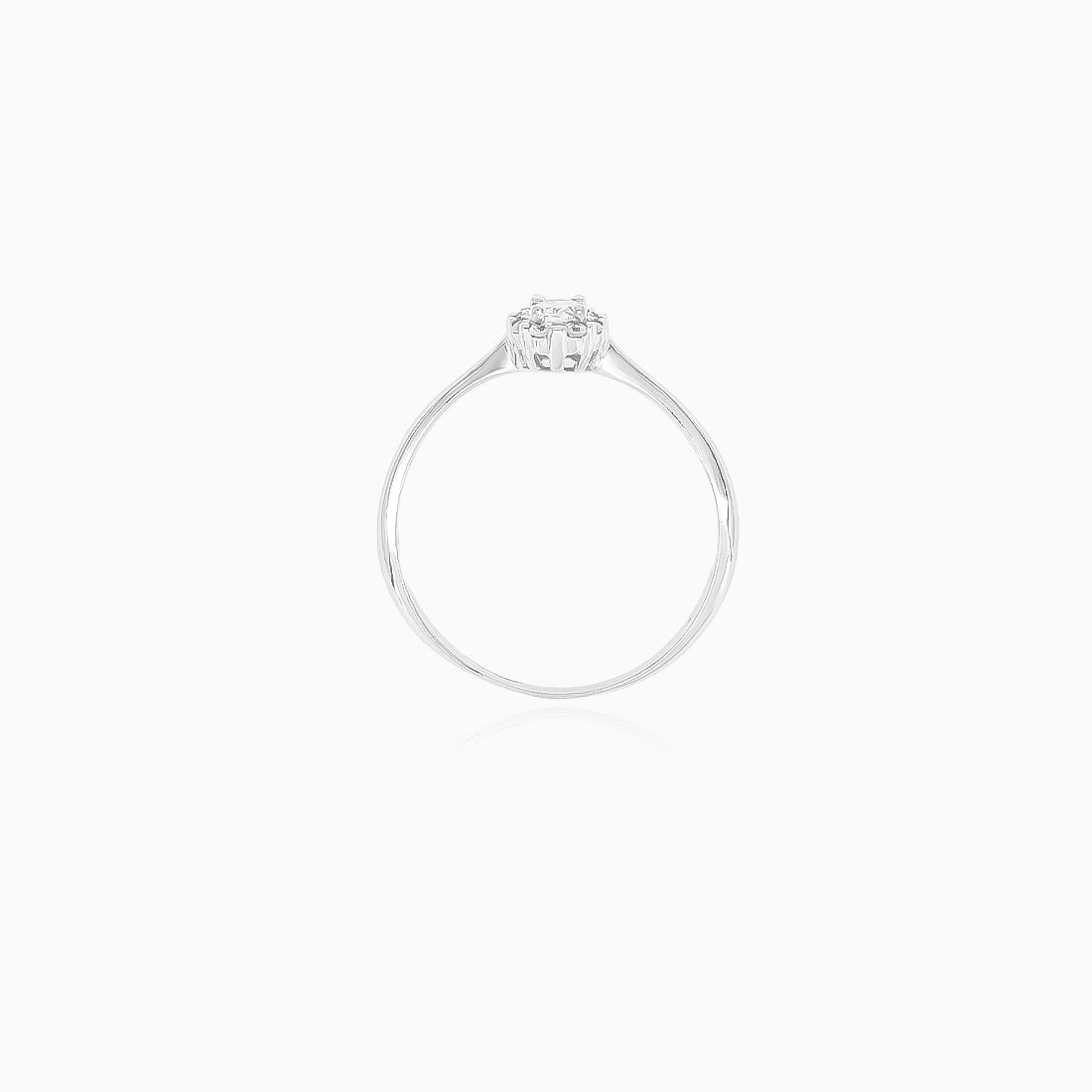 Tento úchvatný prsten ze 14kt bílého zlata je osazen elegantním oválným zirkonem v bezpečném čtyřpaprskovém zasazení. Centrální kámen obklopují menší kulaté zirkony, které šperku dodávají svatozář lesku. Dokonalá kombinace klasického designu a jiskřivé krásy činí z tohoto prstenu nadčasovou volbu.