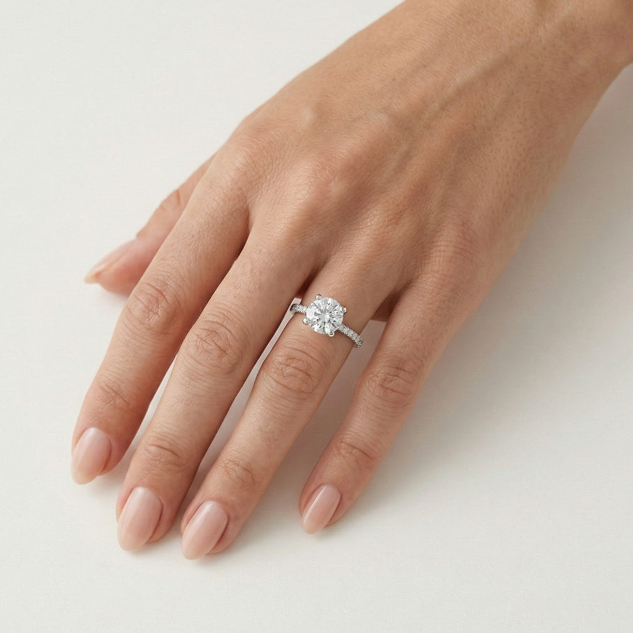 Tento krásný zásnubní prsten v akcentním designu z 14-karátového bílého zlata a velkým centrálním kubickým zirkonem dekorovaný malými kubickými zirkony kulatého brusu na každém rameni prstenu.