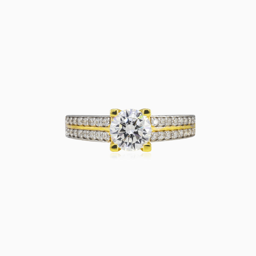 Tento módní prsten je vyroben z 14K žlutého a bílého zlata a je kombinován s jedním velkým centrálním kubickým zirkonem, který má briliantový výbrus, a s několika dalšími menšími kubickými zirkony, které tvoří dvojité linie po obou stranách horní části obroučky.