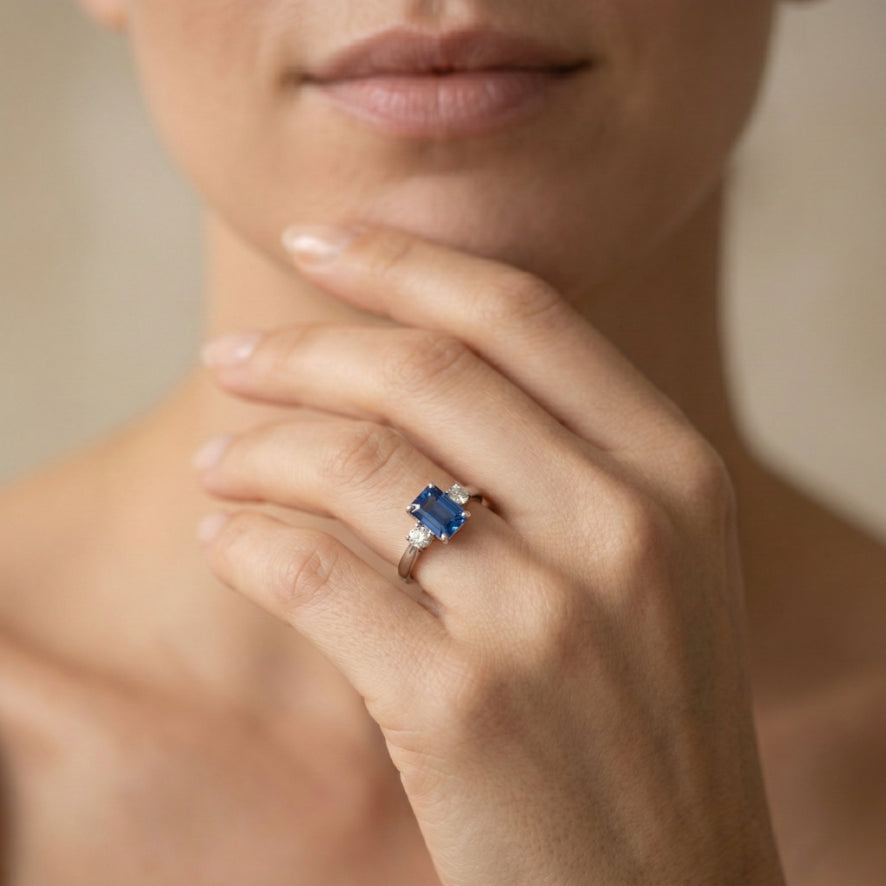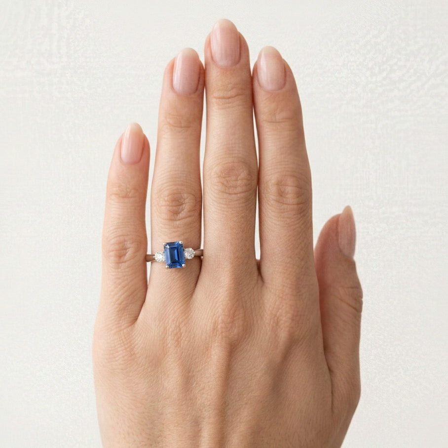 Oslňující prsten z 14-karátového bílého zlata s tanzanitem smarakdového výbrusu celkové váhy 1,42 ct a kulatě broušenými diamanty celkové váhy 0,35 ct.