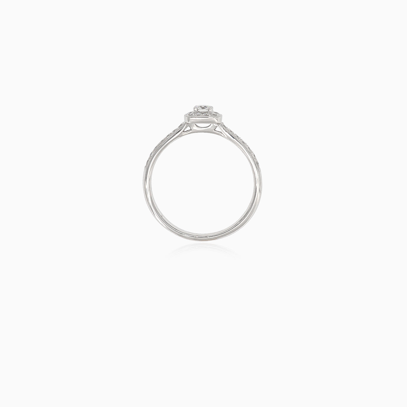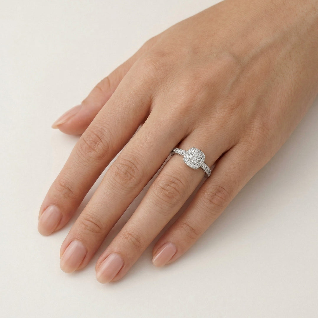 Tento elegantní dámský zásnubní prsten s kulatými diamanty jemného stupňovitého brusu čistoty SI1 a barvy H je zasazen v luxusním 14kt bílém zlatě. Diamanty jsou jemně zasazeny do zářezů, které zdůrazňují jedinečný čtvercový design prstenu zdobený postranními kameny. Tento prsten, který symbolizuje lásku a závazek, je nadčasovou volbou pro váš výjimečný okamžik.