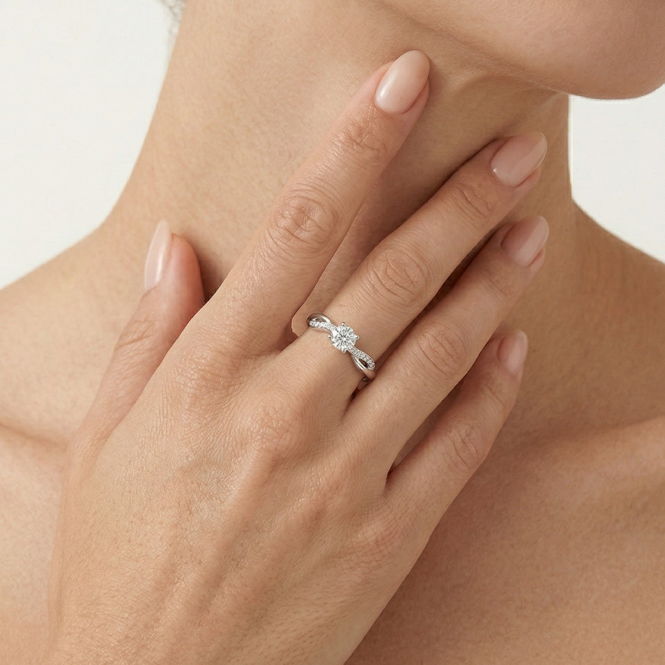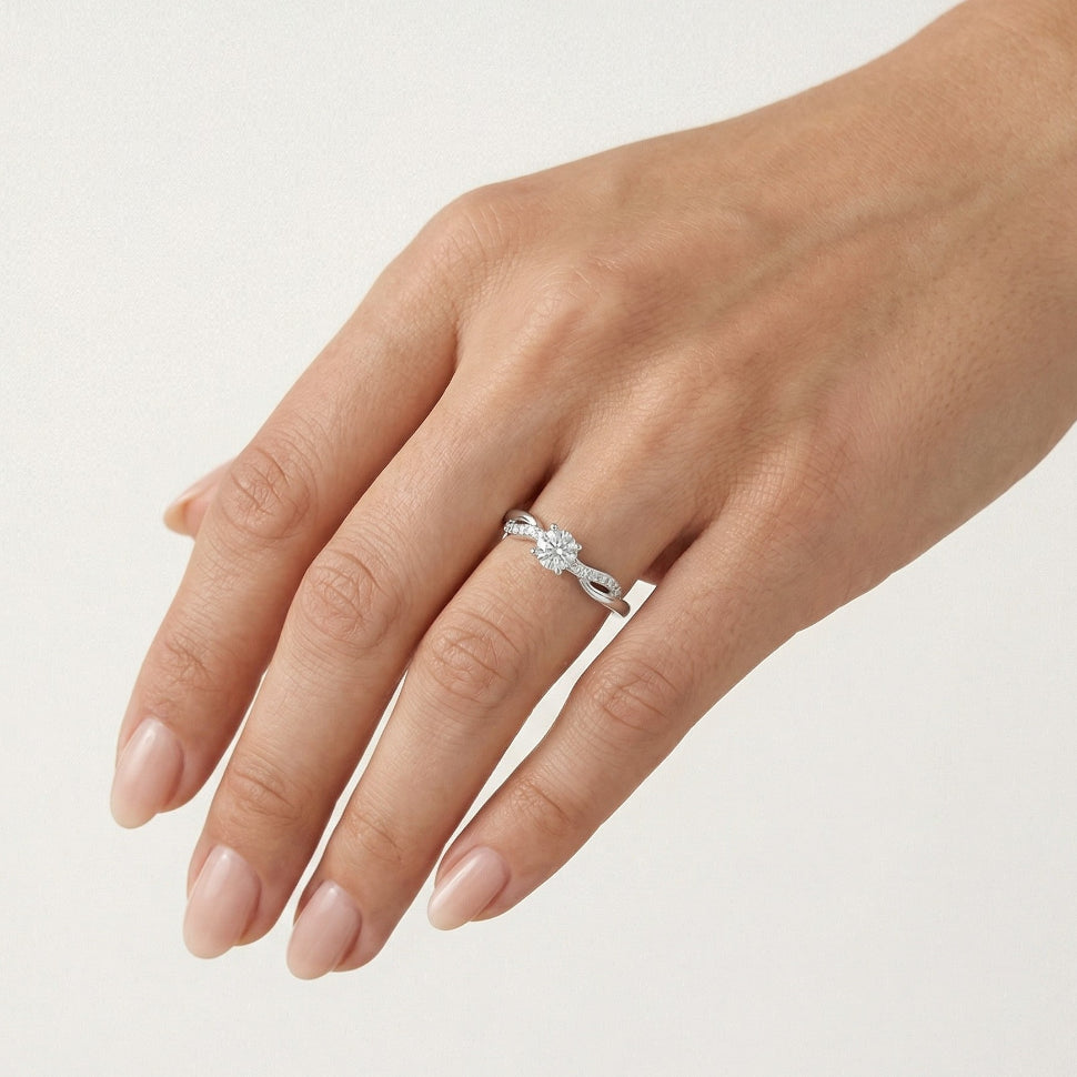 Vylepšete svou žádost o ruku tímto stylovým dámským zásnubním prstenem ze 14kt bílého zlata. Tento prsten s kulatými diamanty jemného stupňovitého brusu čistoty SI1, barvy H, zasazenými v bezpečném zasazení, se pyšní nadčasovým a elegantním designem.