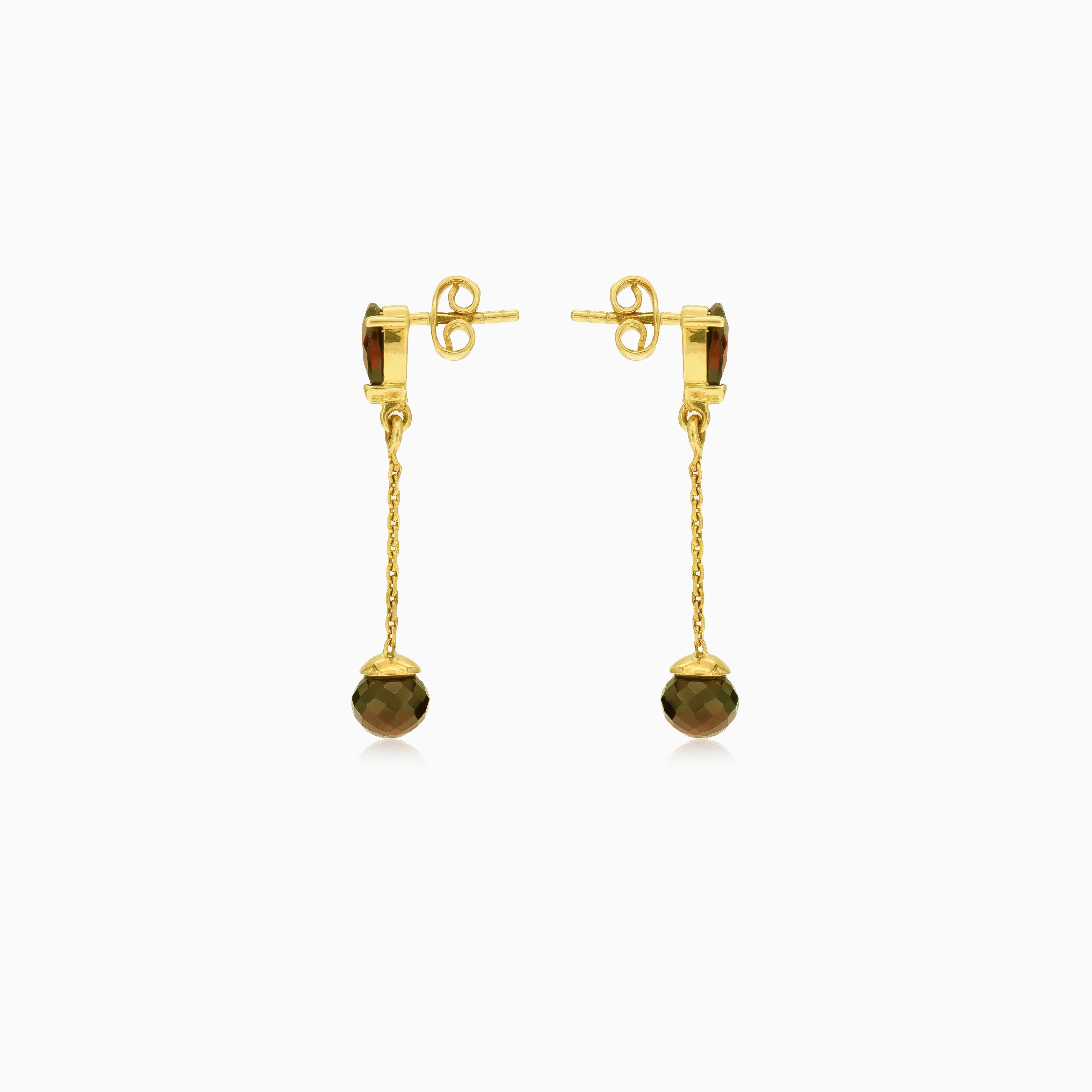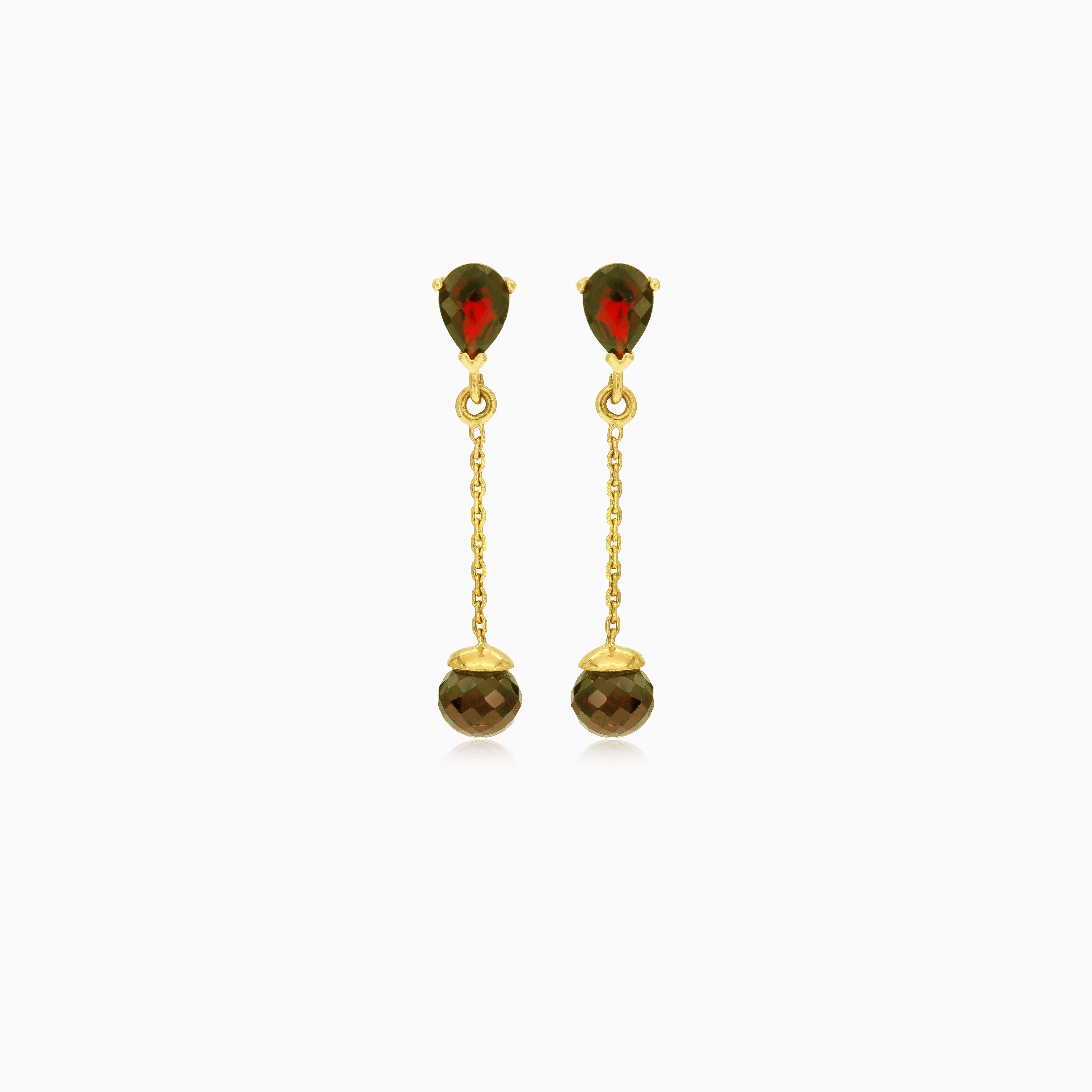 Objevte sofistikovanost v těchto elegantních visacích náušnicích s granáty hruškového a kulatého tvaru s jemným stupňovitým brusem, zasazených ve 14kt žlutém zlatě. Puzetové zapínání a osazení třemi hroty zajišťuje bezpečné a stylové uchycení.