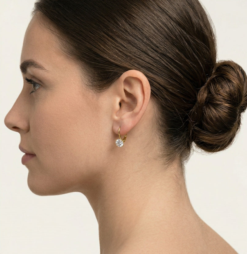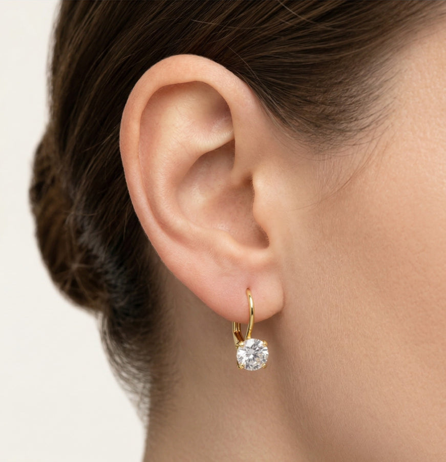 Čtyř-krapnové visací náušnice z 14-ti karátového žlutého zlata s centrálním kubickým zirkonem kulatého brusu.