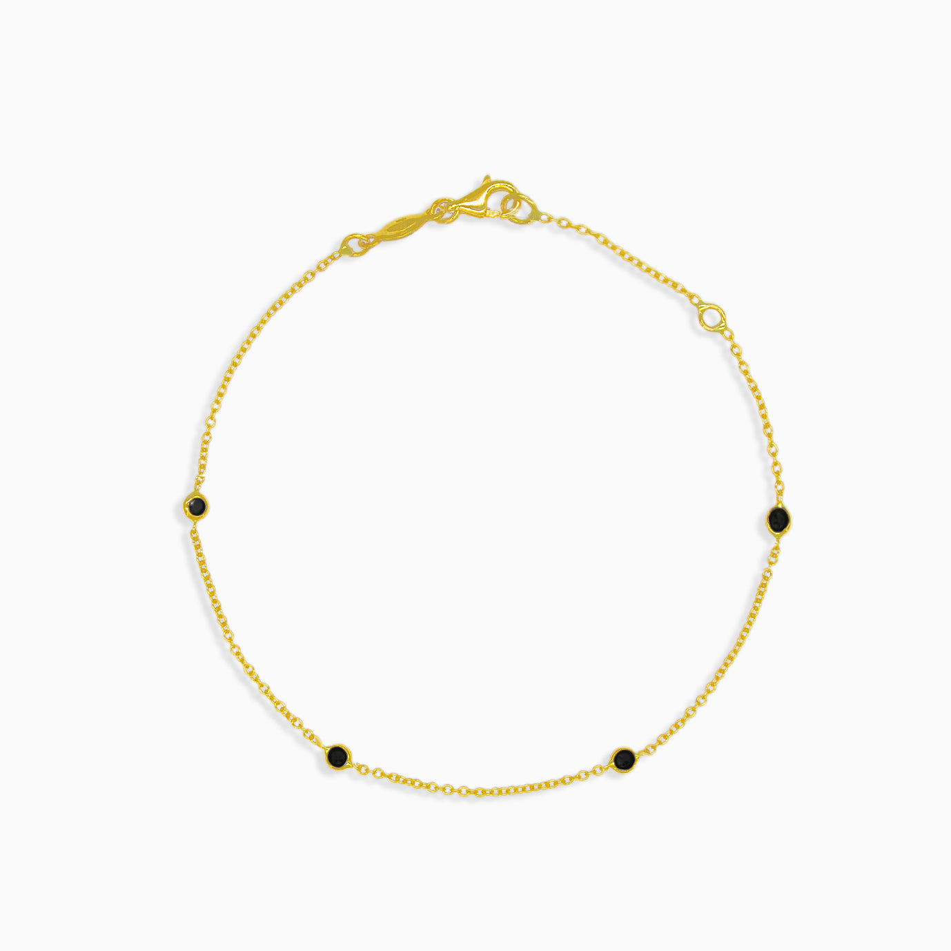 Ozdobte svoje zápěstí elegancí. Tento řetízkový náramek je vyroben z 14kt žlutého zlata a je zdoben čtyřmi kulatými černými onyxy. Náramek je zajištěn karabinovým zámkem pro snadné nošení.