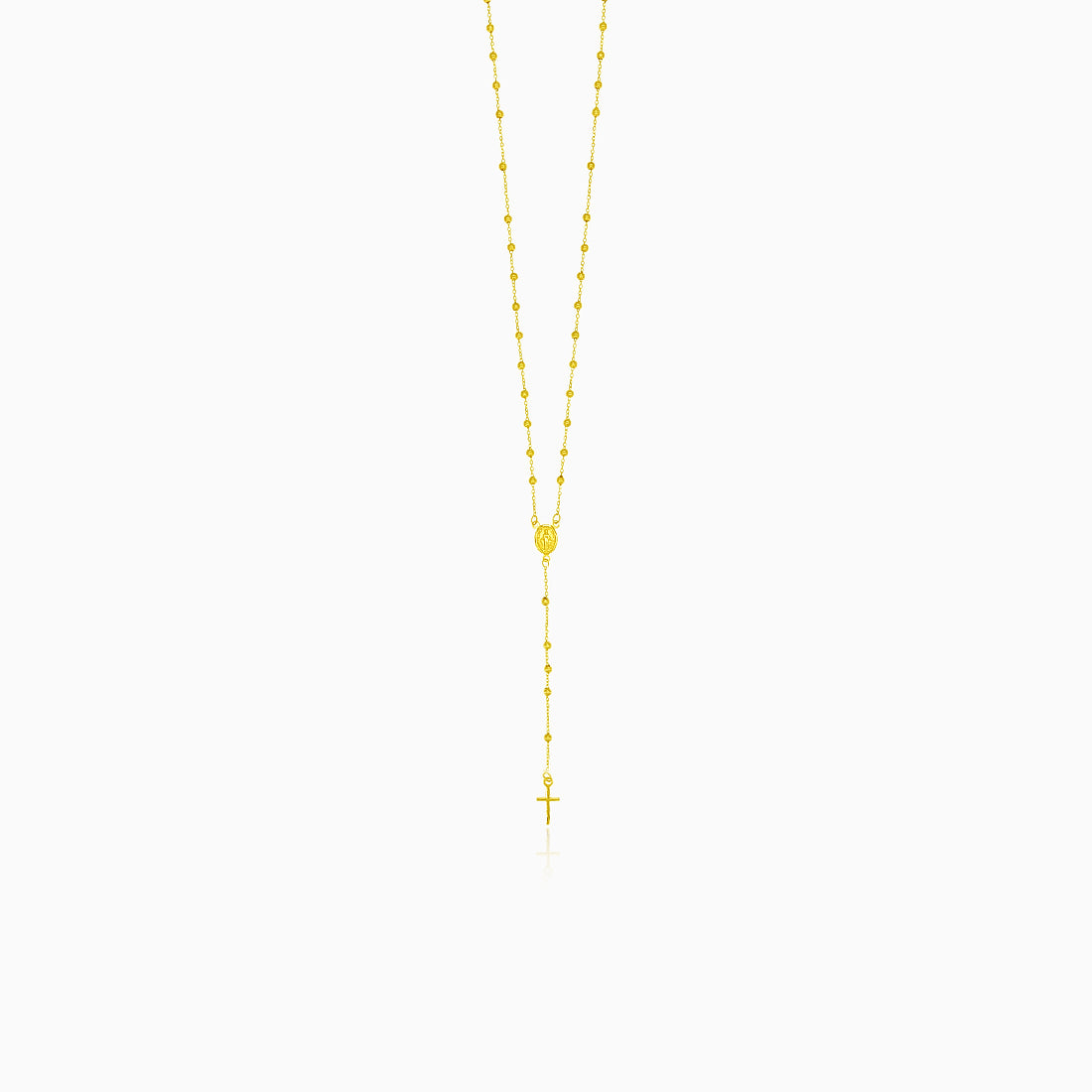 Tento jedinečný růženec je vyroben ze 14kt zlata a na svém spodním konci má medailon. Od tohoto bodu pokračuje řetízek, který vede k jednoduchému, ale nápaditému kříži. Náhrdelník se zapíná pružným kroužkovým zapínáním.