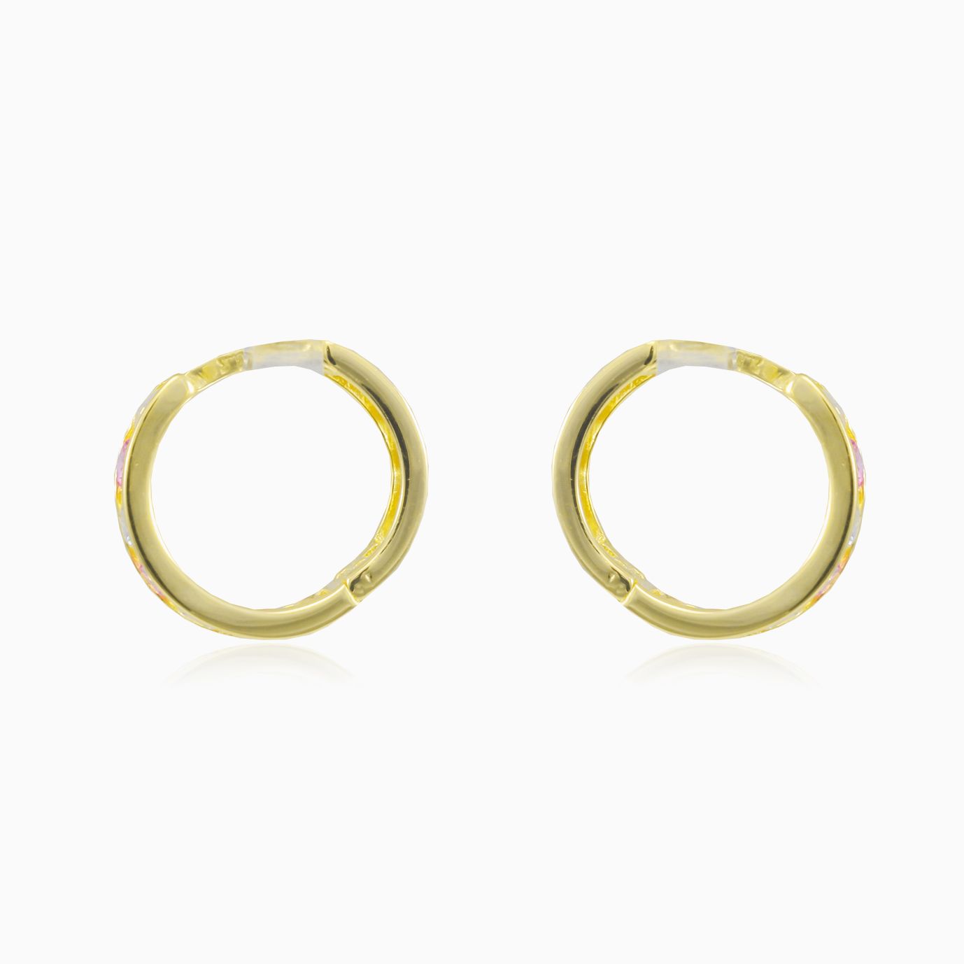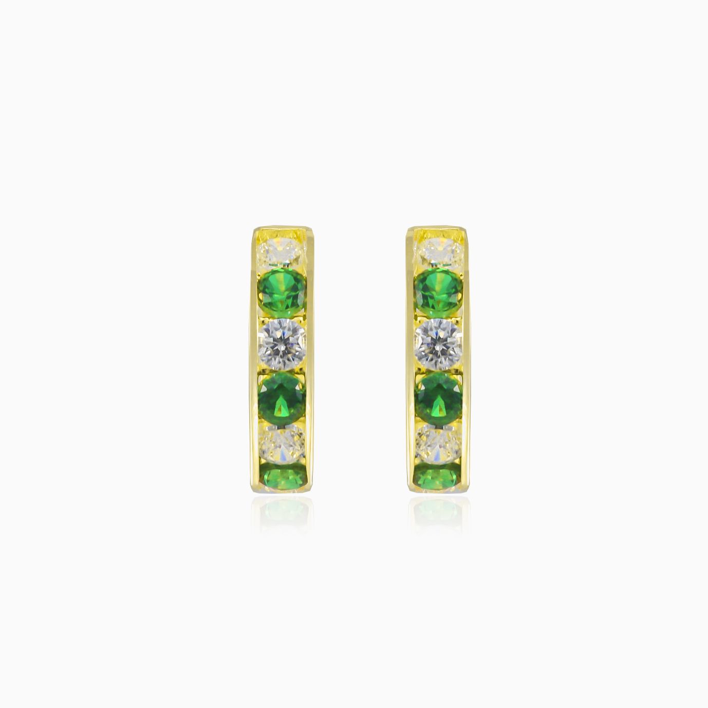 Malé náušnice kruhy z 14-karátového zlata dekorované syntetickým smaragdem a kubickou zirkonií.