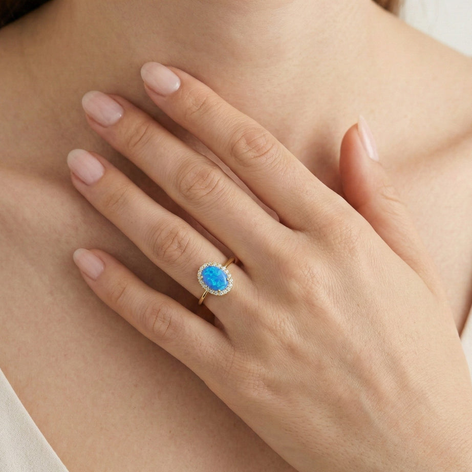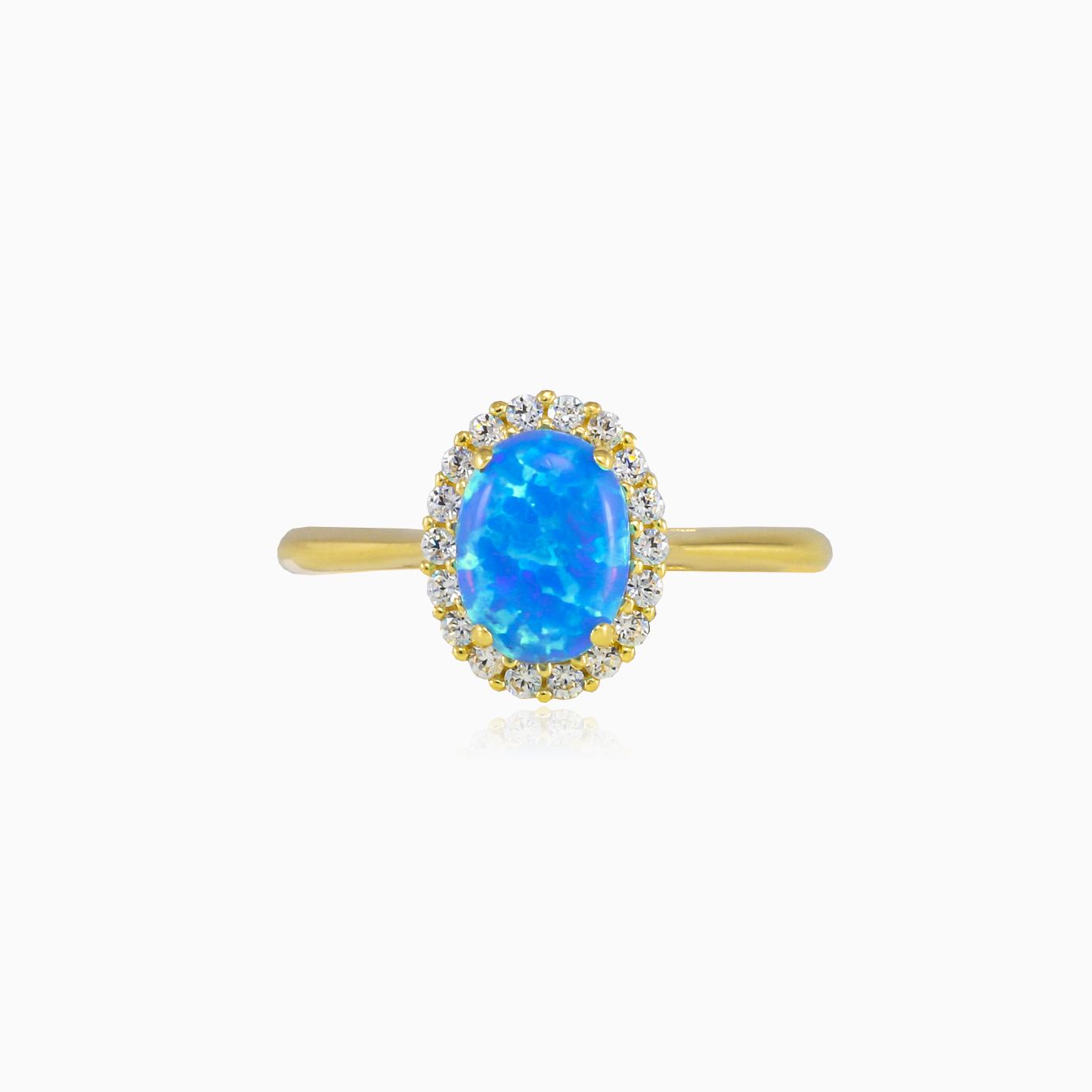 Prsten z 14-karátového žlutého zlata s modrým opálem a aureolou z kubické zirkonie.