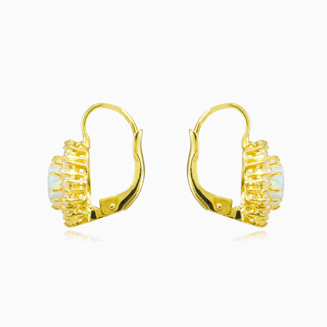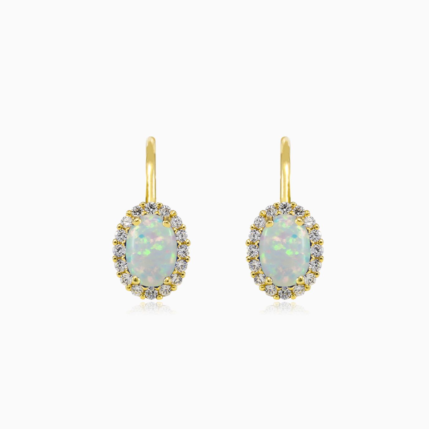 Visací náušnice z 14-karátového žlutého zlata s oválným bílým opálem a aureolou z kubické zirkonie.