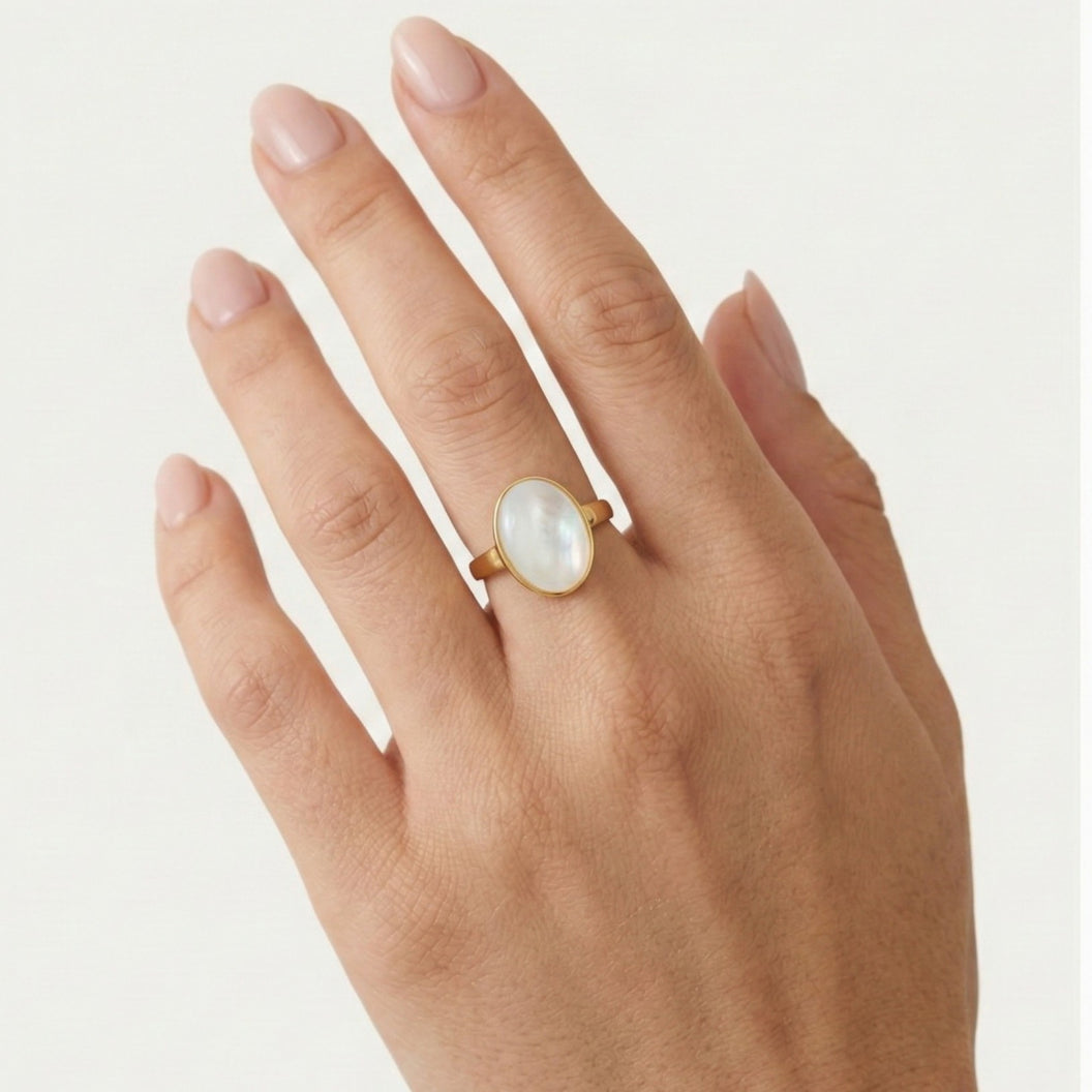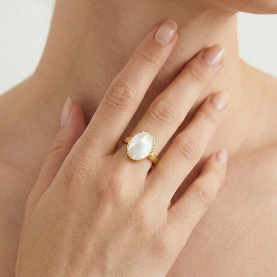 Minimalistický prsten ze 14K žlutého zlata v kombinaci s perleťovou oválnou lunetou.