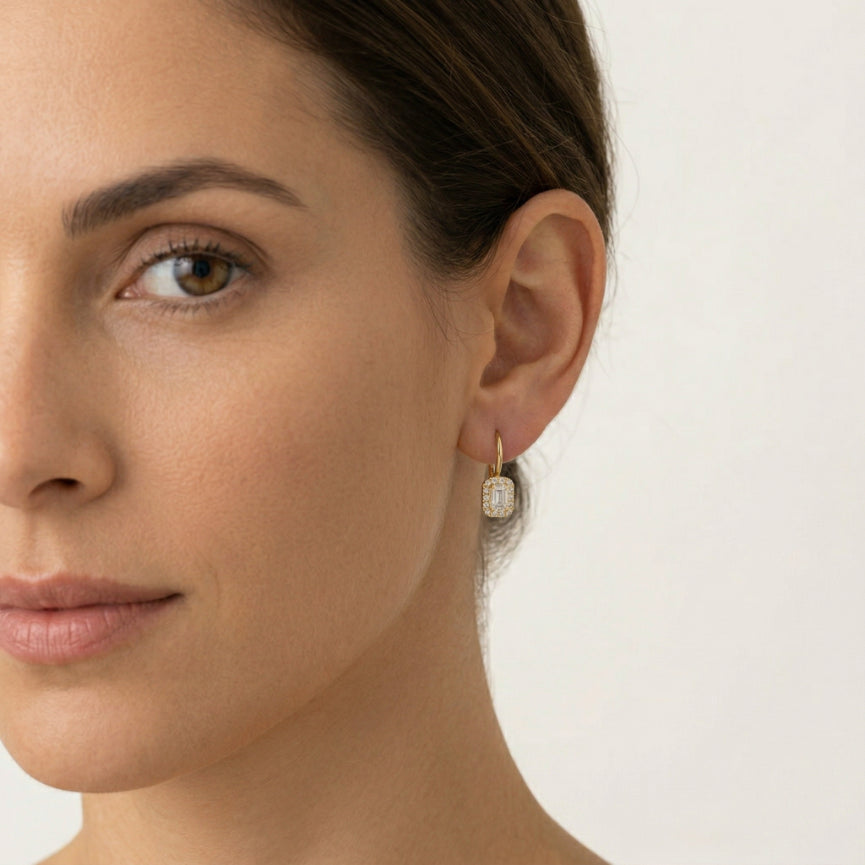 Královské náušnice v kombinaci s velkou centrální kubickou zirkonií ve tvaru emerald a obdélníku tvoří lunetu ze 14karátového zlata.