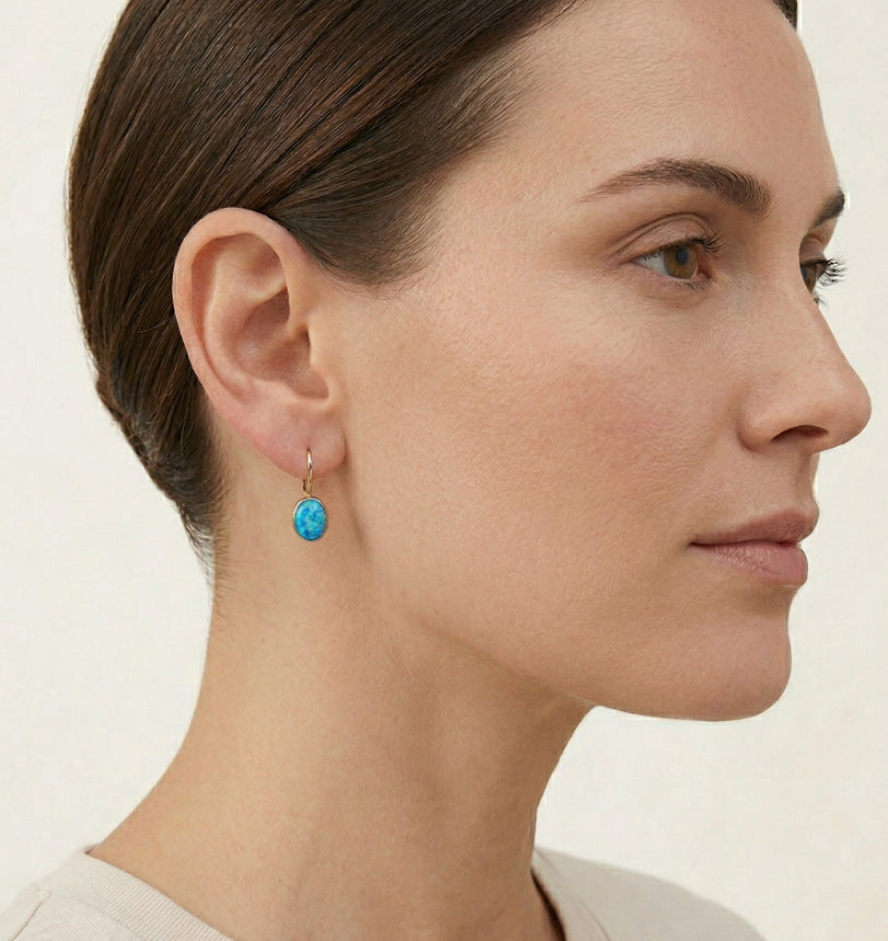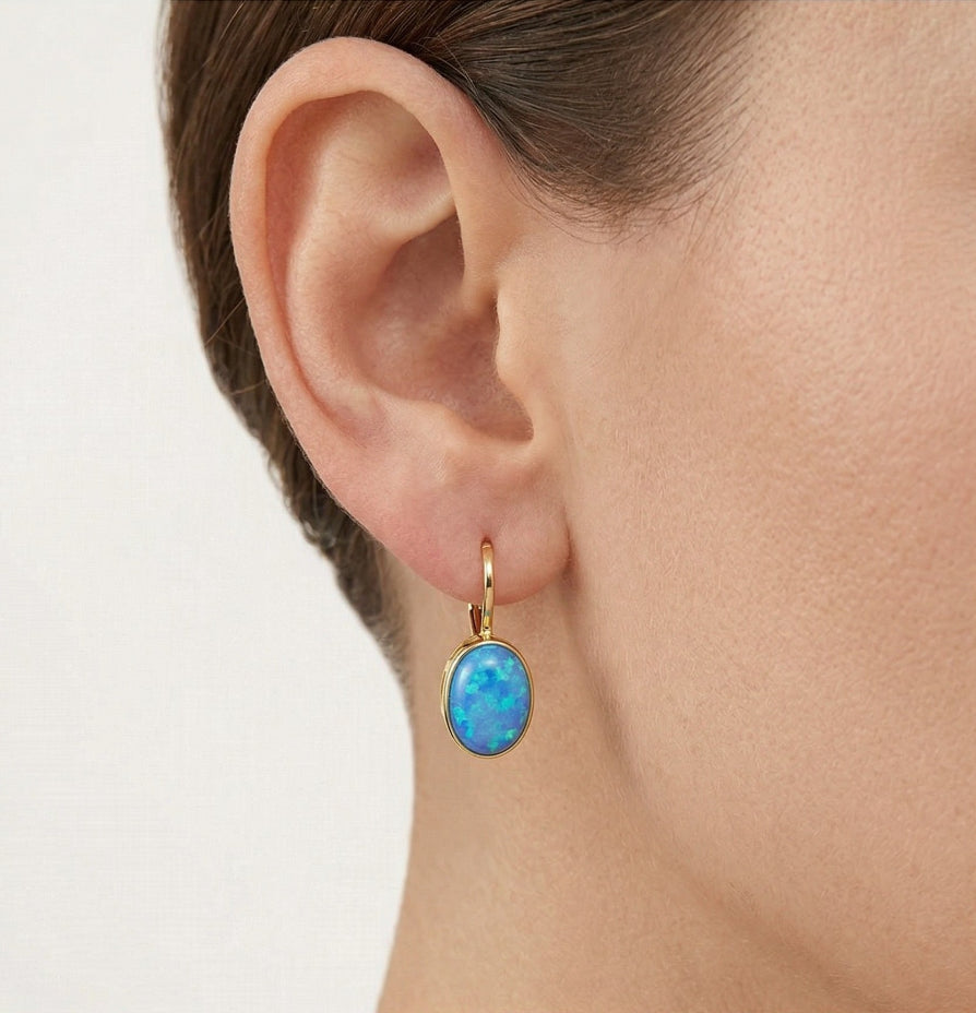 Tyto jednoduché visací náušnice jsou vyrobeny z 14K žlutého zlata a jsou kombinovány s oválnými modrými opály, které jsou zasazeny do ozrnění neboli rámečku. Náušnice mají puzetové uzavírání.
