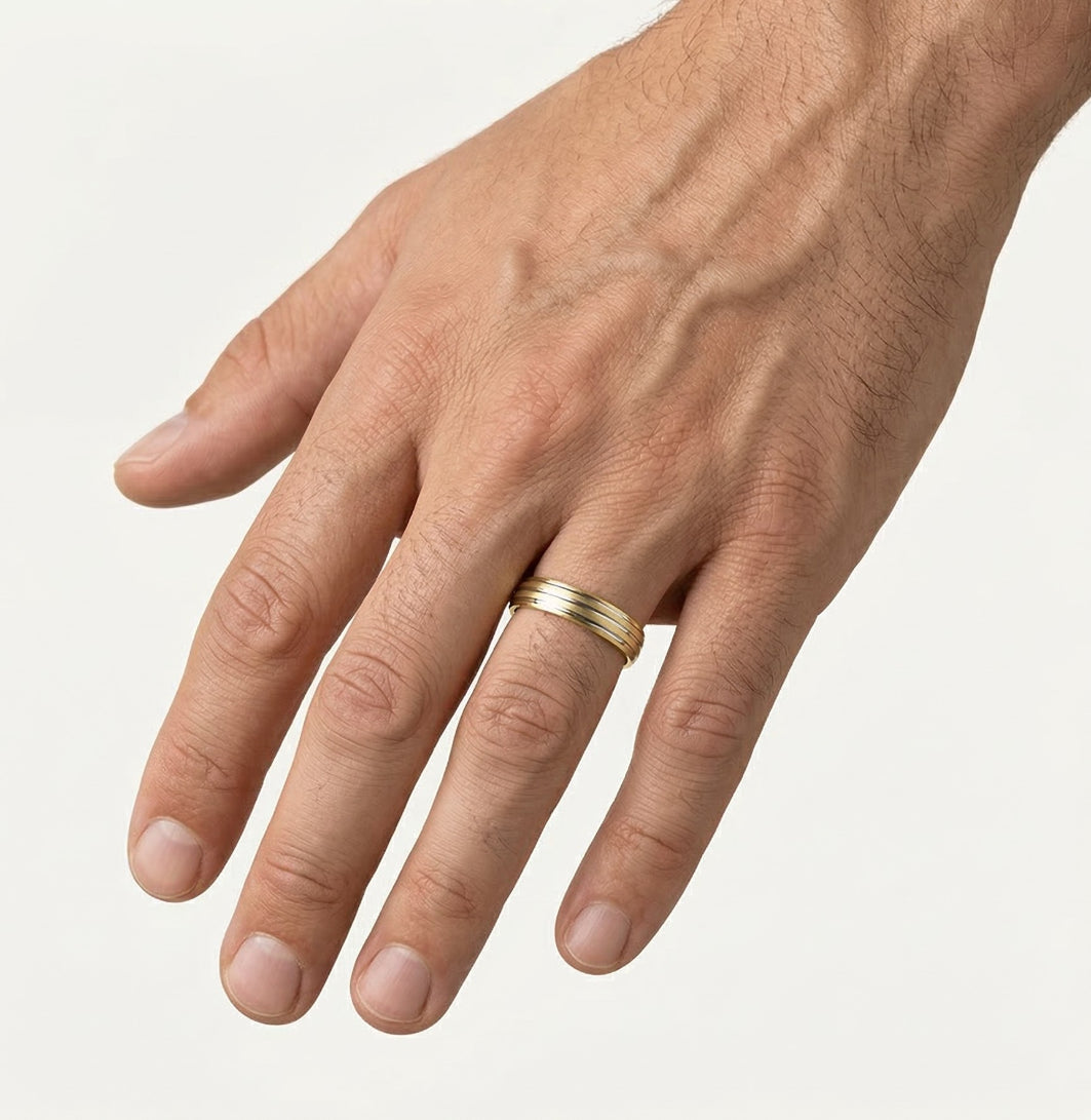 Tento sofistikovaný snubní prsten ze 14kt žlutého zlata je ideální pro ženy i muže. Čtyřmilimetrový prsten má vysoce leštěnou povrchovou úpravu a zdobí ho tři linie vyplněné bílým rhodiem, které dodávají jeho klasickému designu jedinečný nádech. Tento prsten svým elegantním a nadčasovým vzhledem symbolizuje trvalou lásku a závazek.