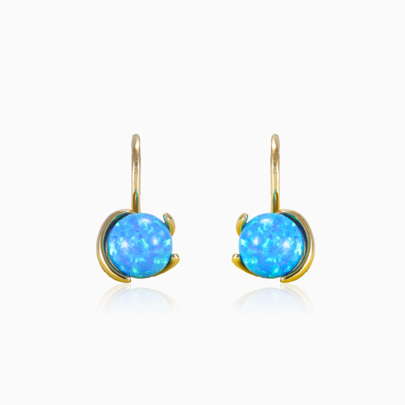 Náušnice jsou vyrobeny z 14K žlutého zlata a jsou doplněny světle modrými opály. Moderní design náušnic zajišťuje krásný celkový vzhled.