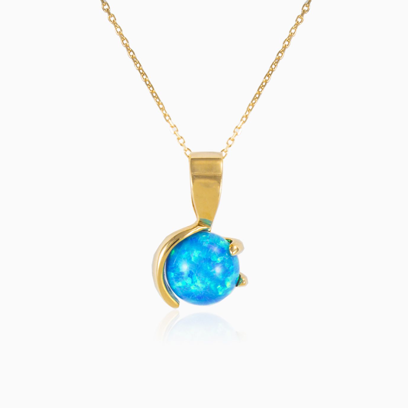 Přívěsek na řetízek je vyroben z 14K žlutého zlata a je doplněn světle modrým opálem, který má tvar kuličky.